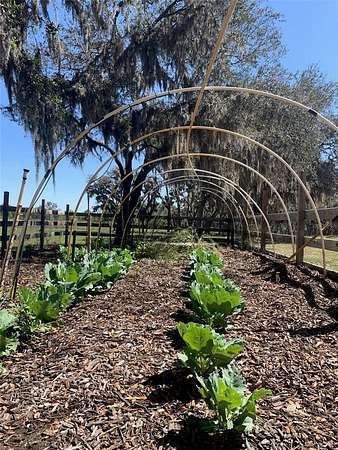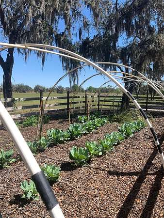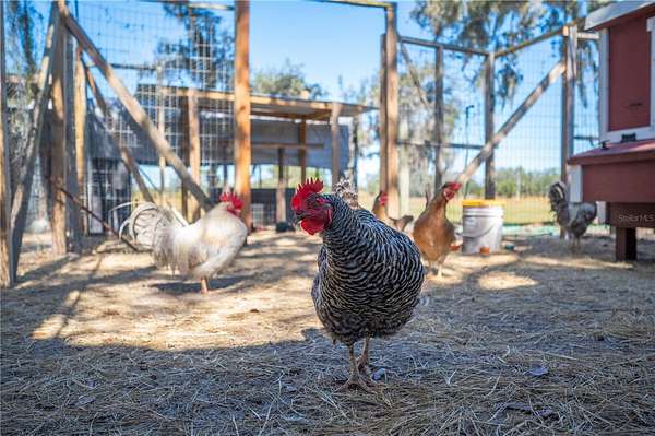 Accessed by a long, private drive with a secluded entry, the property provides exceptional privacy, nestled amongst acres of orange groves, with no noise or light pollution - an increasingly rare feature for both ranching operations and family living. Ideal for uses requiring security, discretion, or uninterrupted activity. The land is fully fenced with established Bahia grass pastures and is cattle- and livestock-ready, featuring barns, livestock and poultry facilities with electric and water, kennels, workshops, RV hookups, storage buildings, gardens, and a