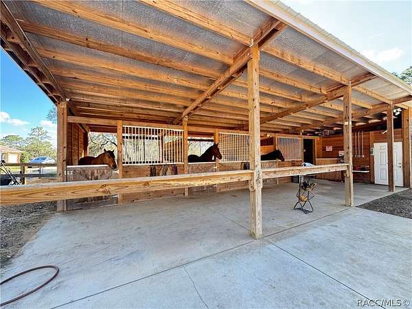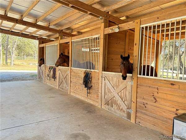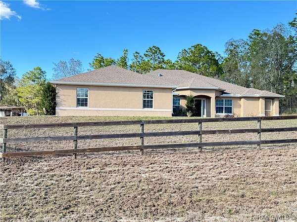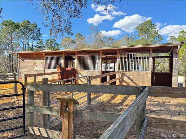 Introducing an exceptional equestrian property located in the highly desirable community of Pine Ridge Estates. This well designed 4 BR, 2.5 bath residence with a 3 car oversized garage is perfectly positioned for comfortable living and serious horse ownership. The home features a light, bright open concept floor plan with a spacious kitchen showcasing beautiful countertops, ample cabinetry and generous workspace. The layout flows seamlessly into the main living areas, creating an inviting space for everyday living and entertaining.Step outside to your private outdoor retreat featuring a overized enclosed lanai and a saltwater pool, perfect for relaxing after a day on the trails. Equestrian improvements include a 3 stall barn complete with tack and feed room plus a substantial secondary barn designed to house a motorhome, horse trailers, tractors and additional equipment. The proprty is fully fenced and cross fenced with. four established pastures, offering excellent rotation and functionality. Situated directly on the community horse trail system, riders can access 28 miles of scenic riding without trailering. Pine Ridge is known for its equestrian friendly zoning, spacious acreage parcels and peaceful setting while remaining conveniently located near shopping, medical facilities, Crystal River waterways and 1 hour from Tampa airport via the Suncoast Parkway. This is a rare opportunity to own an amazing equestrian property in a premier area.