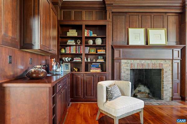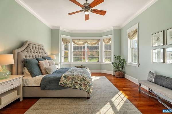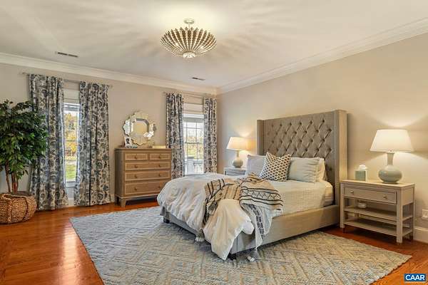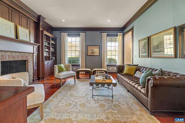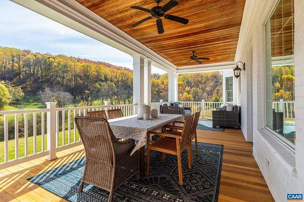 Located in the desirable Ragged Mountain neighborhood, this stately 6 bedroom residence blends timeless architecture with thoughtful, high-end updates. The home offers mountain and pastoral views and an ideal mix of elegance, comfort, and convenience--just minutes from Charlottesville. A gracious columned porch opens to light-filled interiors enhanced with designer lighting, custom wallpaper, window treatments, and freshly refinished spaces throughout. The main level features formal living and dining rooms, a paneled library, and a spacious family room anchored by a marble-surround fireplace. The gourmet kitchen includes premium appliances, stylish pendant lights, and a large island perfect for entertaining. A primary suite on the main level offers the ease of first-floor living, while a second primary suite upstairs enjoys mountain views and a spa-like bath. Additional bedrooms, a second-floor laundry, and a third-floor bonus space--ideal for a playroom, recreation area, or studio--complete the upper levels. The lower level offers a full floor of recreation with a movie theater, gym, and new hot tub. Exterior highlights include a freshly stained deck, repaved driveway, and updated lighting.