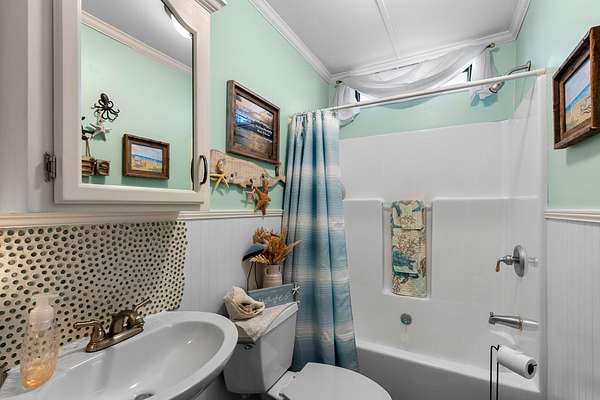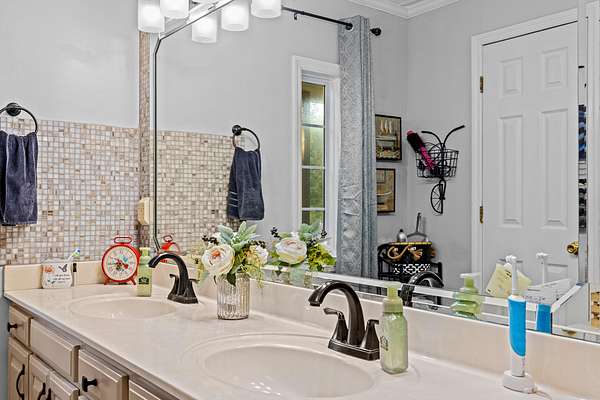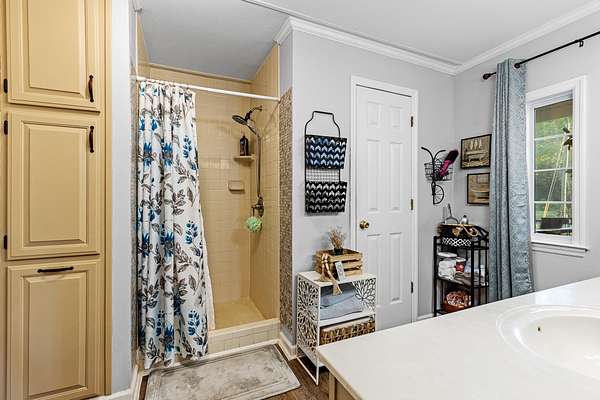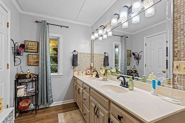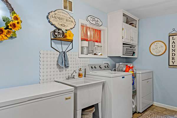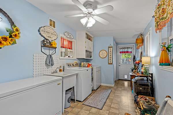 The primary bedroom is bathed in natural light and opens to a spacious en-suite bath complete with a walk-in shower, dual sinks on a double vanity, and abundant cabinetry for storage. Two additional bedrooms share a well-appointed bathroom, while a dedicated laundry room with sink and exterior exit adds convenience.