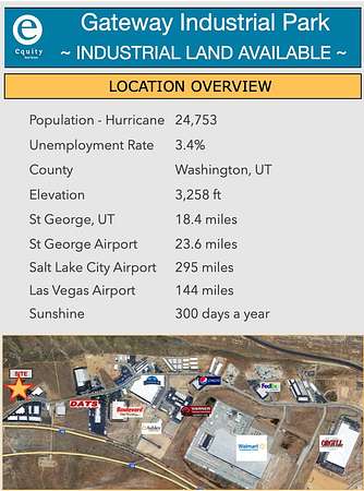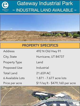 Est $6,530/moPrime Industrial Land in Gateway Industrial Park Hurricane, UT. Excellent location just minutes from I-15 and SR-9. Six individual industrial lots available totaling 21.659 acres, with lot sizes ranging from 1.871 to 7.677 acres. Offered at $11 per square foot - $479,160/ acre.. Fully improved parcels with all utilities and infrastructure in place and ready for immediate development. Flexible layout and design options make this an ideal opportunity for a wide range of industrial or commercial uses. Whether you're expanding, relocating, or developing, this strategic location offers excellent access, flexibility, and long-term value.