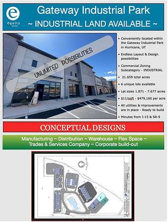 Est $16,742/moPrime Industrial Land in Gateway Industrial Park Hurricane, UT. Excellent location just minutes from I-15 and SR-9. Six individual industrial lots available totaling 21.659 acres, with lot sizes ranging from 1.871 to 7.677 acres. Offered at $11 per square foot - $479,160/ acre.. Fully improved parcels with all utilities and infrastructure in place and ready for immediate development. Flexible layout and design options make this an ideal opportunity for a wide range of industrial or commercial uses. Whether you're expanding, relocating, or developing, this strategic location offers excellent access, flexibility, and long-term value.