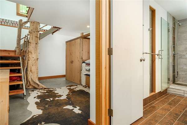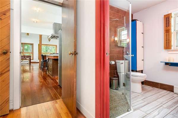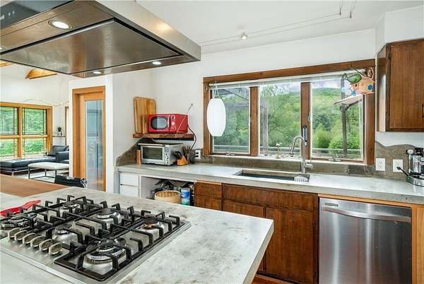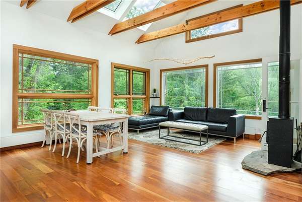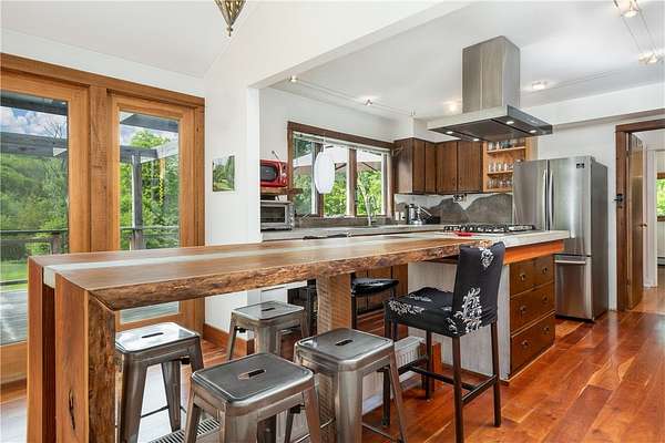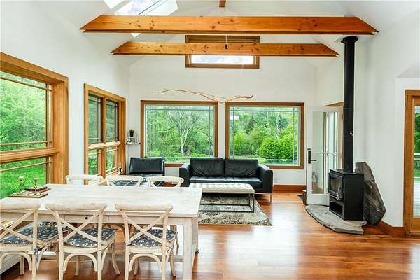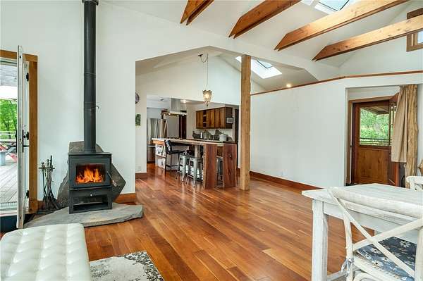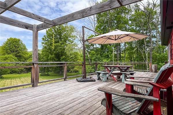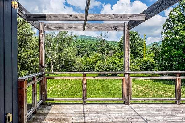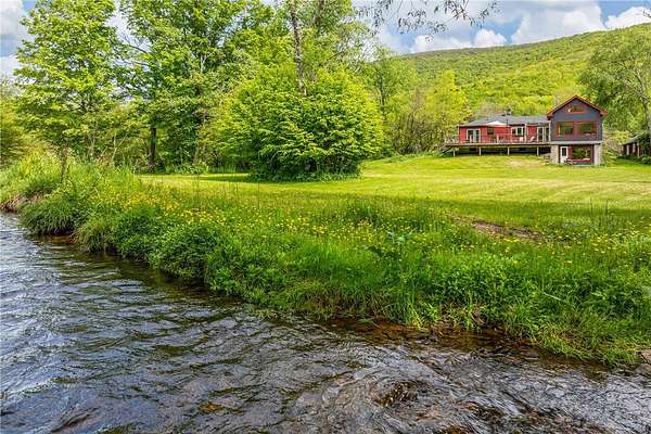 Built just above the tranquil Batavia Kill that flows year-round, this exceptional rustic contemporary residence offers nearly two acres of superior living environment in a well-designed package for those who appreciate finer living. The home features three spacious bedrooms, plus an option for a dedicated home office or flex space, and two full bathrooms-ensuring optimal comfort and privacy for every member of your household. A remarkable extension (2016) adds exposed beams, reclaimed-wood, rich cherry flooring, and expansive glass windows that capture the untouched mountain views while introducing a sophisticated modern aesthetic. This extension brings the total livable square footage, including the new lower level, to 1,720 sqft. And, for an added touch of connection to the land, the posts and railings are constructed from trees harvested on the property. The kitchen is appointed with premium appliances, concrete countertops, and a distinctive live-edge center island-creating an ideal environment for gatherings and entertaining while preserving the workflow for culinary enthusiasts. Located within the desirable Denver-Vega valley, this property is a combination of scenic views, coveted privacy, and an authentic Catskill living experience. Imagine yourself, cool beverage in hand, as you step out onto the generous back deck. Take in the aroma of the grill, amble down the stairs to the level lawn and play alongside the babbling Batavia Kill brook. The mountains create a breathtaking natural frame for this refined sanctuary-a residence that may quickly become your favorite escape. As an added benefit, this property has rights to a much-sought-after membership in the exclusive Roxbury Run Country Club offering access to private amenities such as a pool and tennis courts (to be negotiated separately, and annual dues and fees apply; details available upon request). Ideally positioned minutes from Roxbury & Margaretville, and < 2.5 hrs from New York City, this property is a rare opportunity to secure a high-performing asset in the Catskills' real estate market. Claim your retreat-an investment in relaxation, enduring value, and the classic Catskill lifestyle.