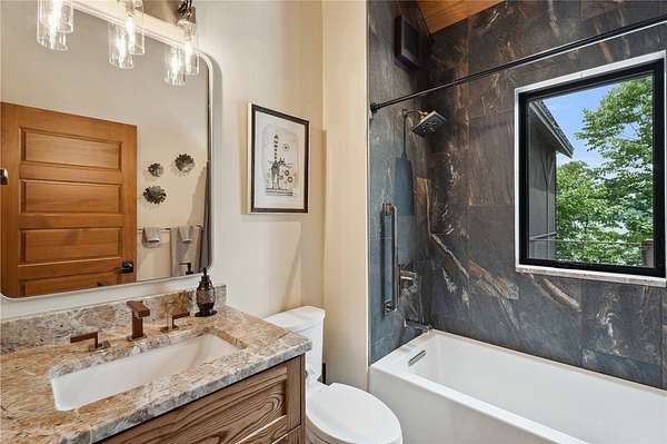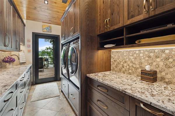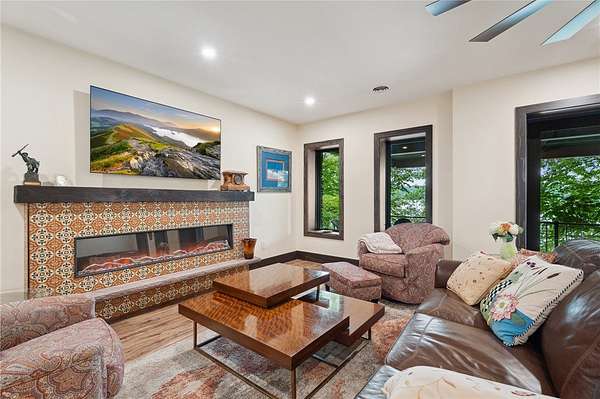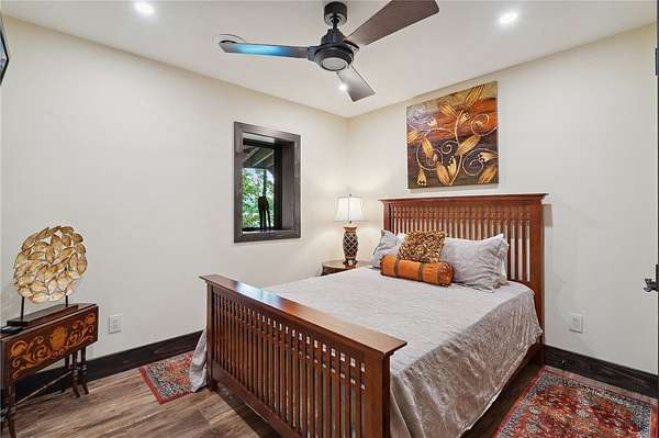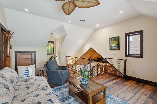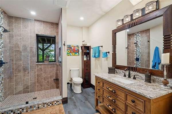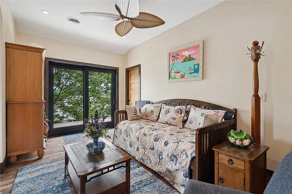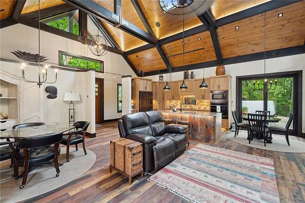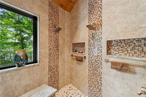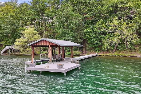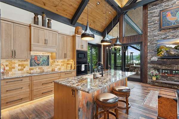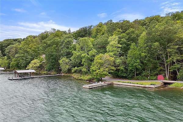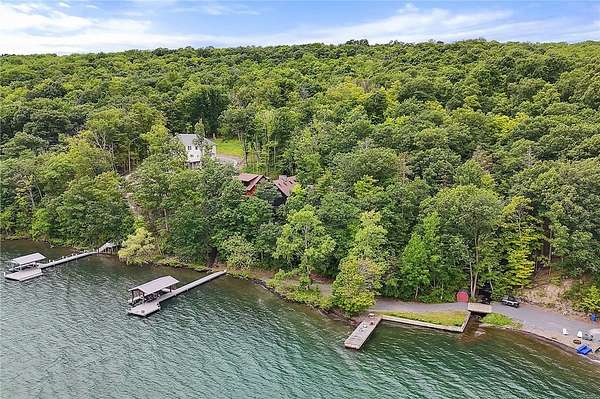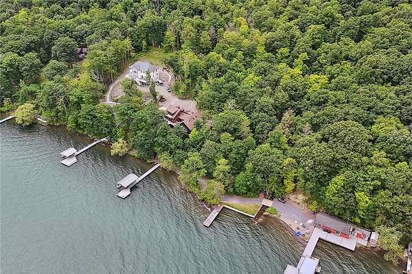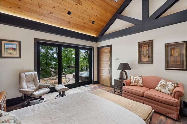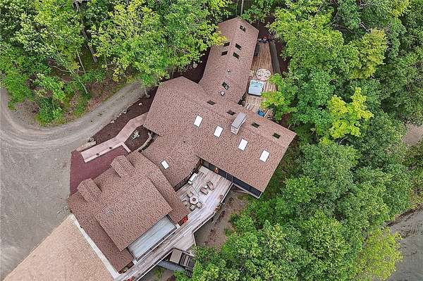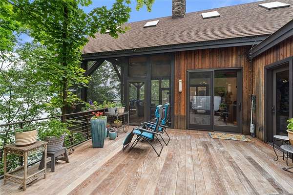 This truly exceptional lakeside estate offers over 13 acres of wooded serenity, complete with a meandering stream, three cascading waterfalls, and 300 feet of private shoreline. Thoughtfully designed by local architect and visionary builder, completed in 2023, every inch of this 5+BR, 4BA home reflects masterful craftsmanship, high-end materials, and a seamless blend of modern luxury and natural beauty. The expansive interior spans multiple levels that can easily be adapted into separate living spaces, with a wheelchair-accessible main level featuring a luxurious primary suite. Smart, eco-friendly features include geothermal heating and cooling, instant hot water faucets and showers, and integrated smart lighting, while whimsical design touches create a sense of wonder throughout. Clad in durable Shou Sugi Ban-treated Larch and Cypress trim, the home is built to inspire and endure. Multi-level IPE wood decks stretch across the lakefront, converging in a stunning sunroom cantilevered over the water. A 3-car garage is pre-wired for three EV charging stations, and a private tram glides from the house to the beach, where you'll find two docks, a covered automatic boatlift, and a separate beach-access driveway. Quiet sitting areas are tucked throughout the grounds, thoughtfully positioned to highlight the surrounding natural splendor-this is lakeside living at its most luxurious. Sellers respectfully request that appointments are scheduled before entering the private road.
