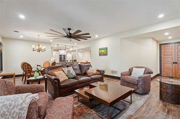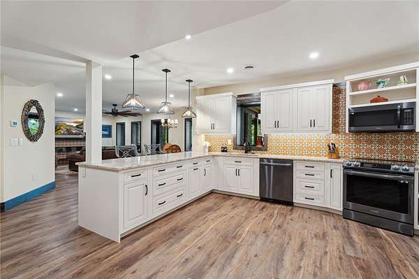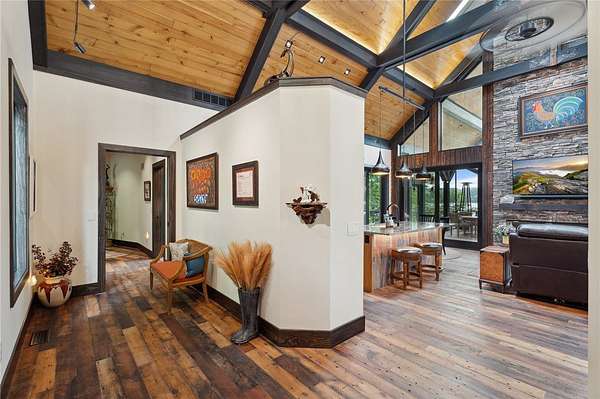 - Breakfast Bar, Cathedral Ceilings, Ceiling Fans, Den, Eat In Kitchen, Entrance Foyer, Granite Counters, Great Room, Guest Accommodations, Home Office, Kitchen Family Room Combo, Kitchen Island, Living Dining Room, Natural Woodwork, Second Kitchen, Skylights, Sliding Glass Doors