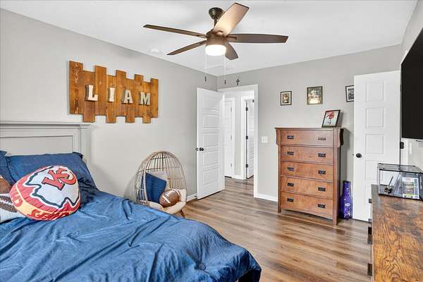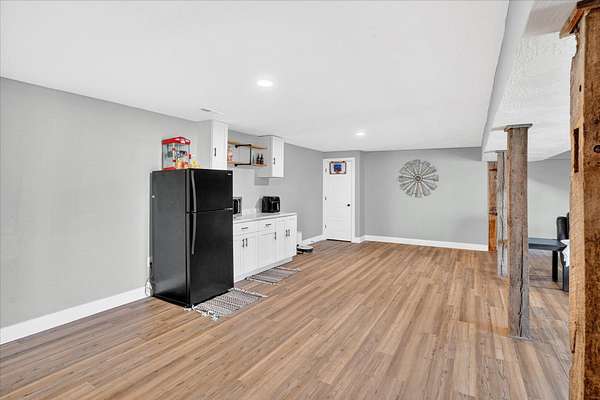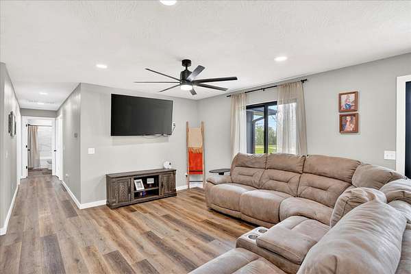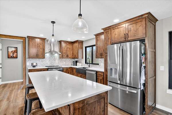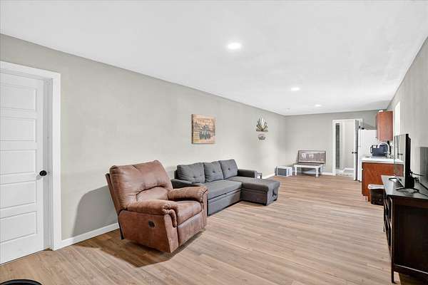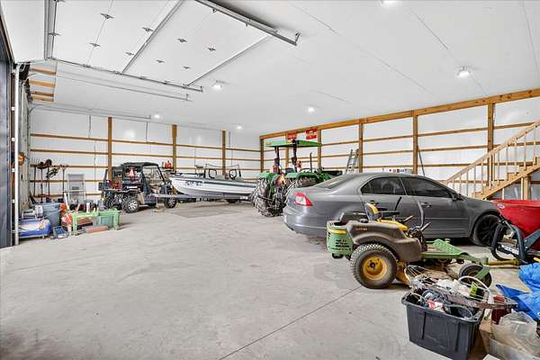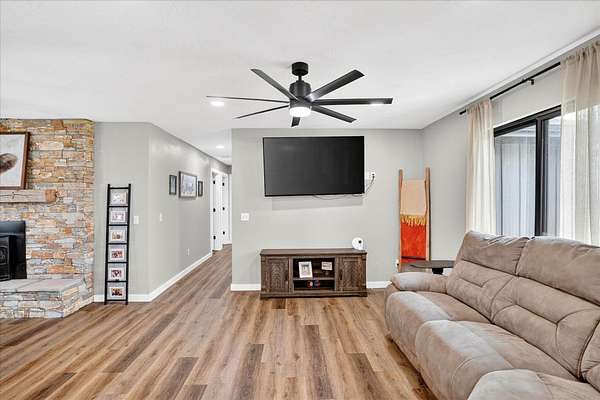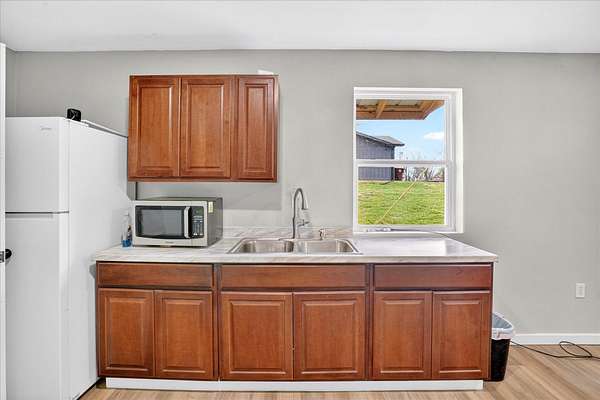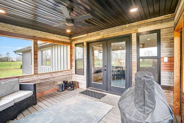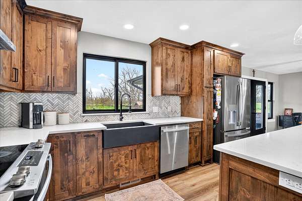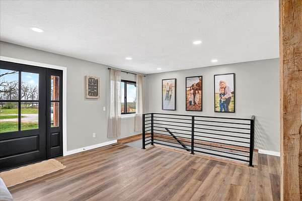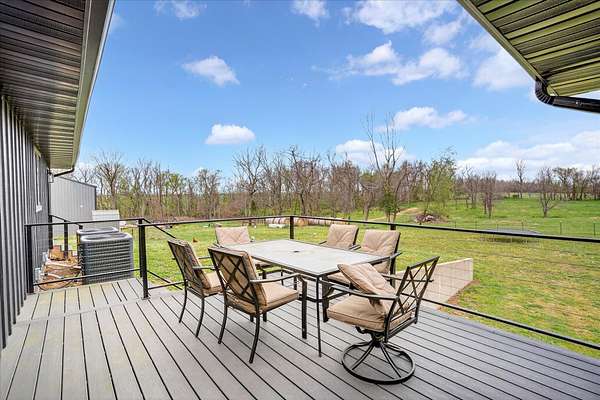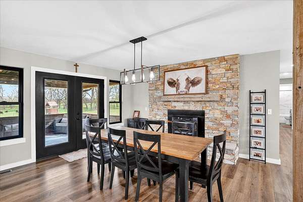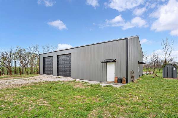 Welcome to modern country living in Clever! Set on just over 41 acres, this fully renovated down to the studs property offers a rare blend of function and design with over 4,200 square feet of thoughtfully updated living space. From the covered front entry with timber accents to the bright, open interior, the home has an inviting feel from the moment you walk in. Black Andersen windows bring in natural light and frame the surrounding views, while updated HVAC systems and custom railing add to the overall quality and comfort. The main level is both spacious and practical with the primary suite, two guest bedrooms with oversized closets, a hall bath, office, mudroom and laundry with rear access, and a half bath just off the kitchen. The kitchen stands out with rich custom wood cabinetry, soft close hinges, a large island, stainless appliances, and a walk in pantry, flowing seamlessly into the dining area anchored by a stone wood burning fireplace. Just beyond, a covered screened porch creates the perfect space for slow mornings, summer evenings, and taking in the peaceful setting. The primary bath offers a soaking tub and walk in tile shower, creating a quiet retreat at the end of the day. Downstairs, you will find two additional bedrooms, a third non conforming bedroom, generous storage, and a second living space with another fireplace and kitchenette, giving flexibility for guests, entertaining, or multi generational living. The 40x60 shop with 480 square feet of finished living quarters adds even more versatility for hobbies, a home business, or additional living space. The land itself is open, usable, and well suited for livestock, already equipped with automatic waterers and designed to support a true working or hobby farm lifestyle