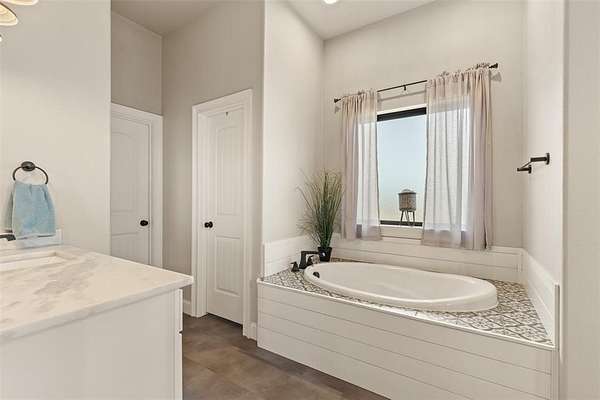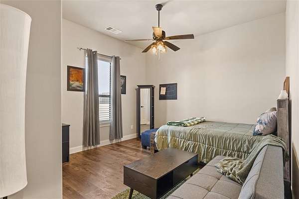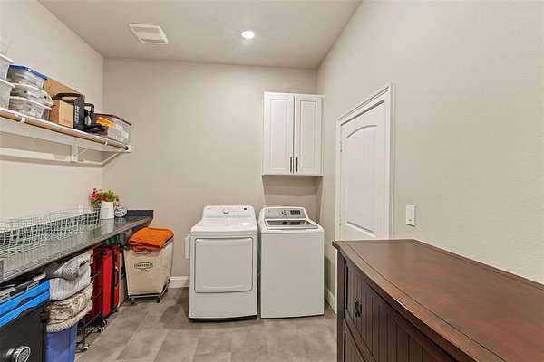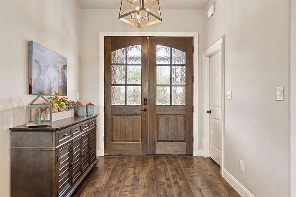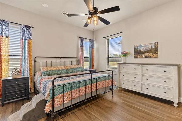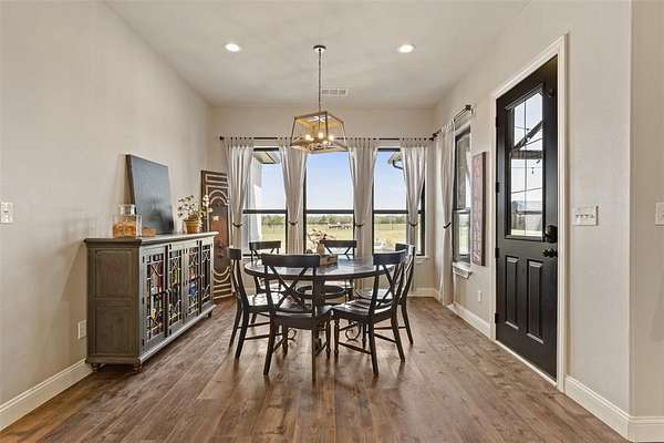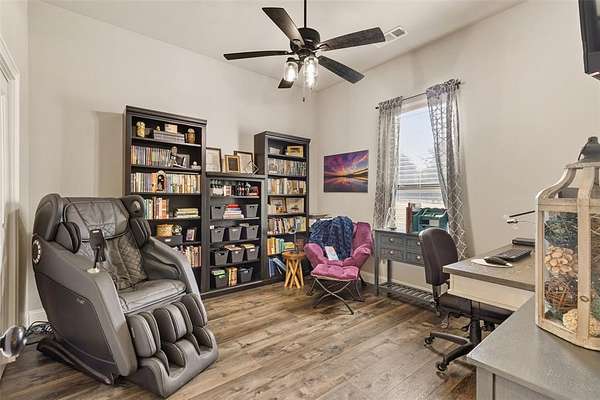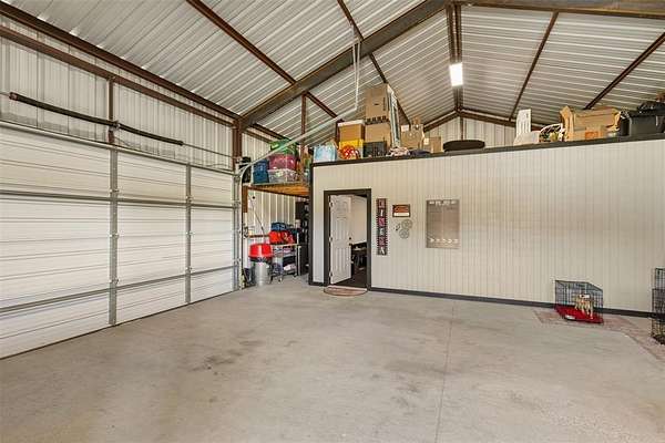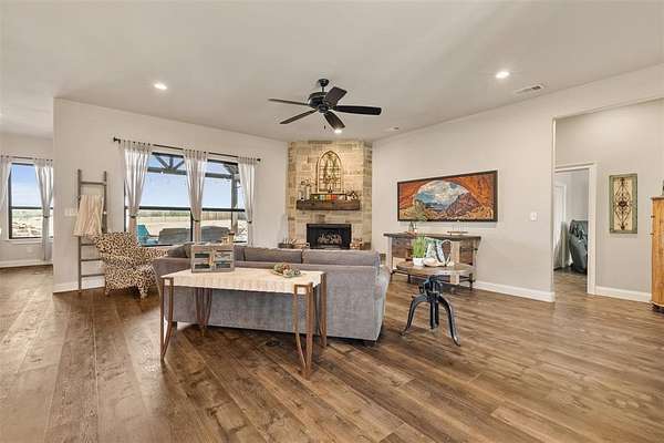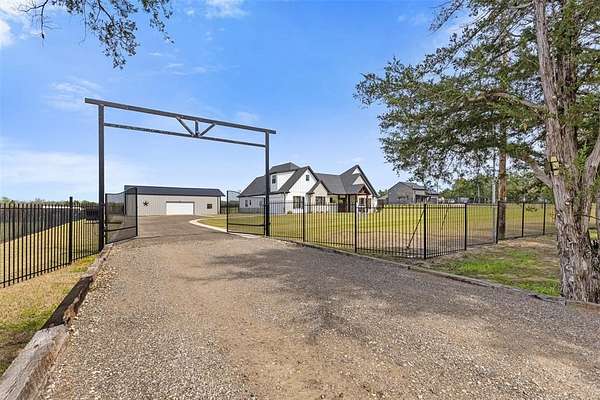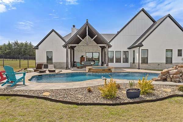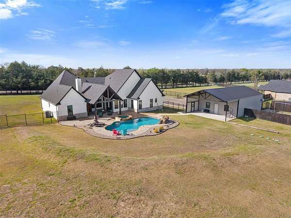 Welcome to your private retreat on 1.613 acres, where modern luxury meets wide open Texas living. This beautifully designed 3,005 square foot home offers 4 bedrooms, 3.5 bathrooms, a dedicated office, and a flexible upstairs suite perfect for guests, additional living space, or even a second primary bedroom. Step inside to an expansive open concept layout where the living, dining, and kitchen areas flow seamlessly together. Rich LVP flooring, abundant natural light, and a stunning stone fireplace create a warm and inviting atmosphere. The chef inspired kitchen features granite countertops, an oversized island, gas cooktop, double ovens, and a spacious walk in pantry, making it ideal for both everyday living and entertaining. The private primary suite is tucked away and offers a spa like bathroom with a walk in shower, soaking tub, dual vanities, and direct access to the laundry room through the oversized walk in closet. The split bedroom design provides added privacy for family and guests. Step outside and enjoy resort style living with a covered patio overlooking a heated pool and spa, surrounded by beautiful landscaping and wide open space. The fully fenced property also includes a full size batting cage with turf, creating a unique outdoor experience. The impressive 1,200 square foot shop is equipped with electricity and water and includes a 20 by 16 insulated media room with dedicated heating and cooling, along with full network and TV wiring. If you have been searching for space, style, and functionality all in one exceptional property, this is the one. Schedule your showing today!