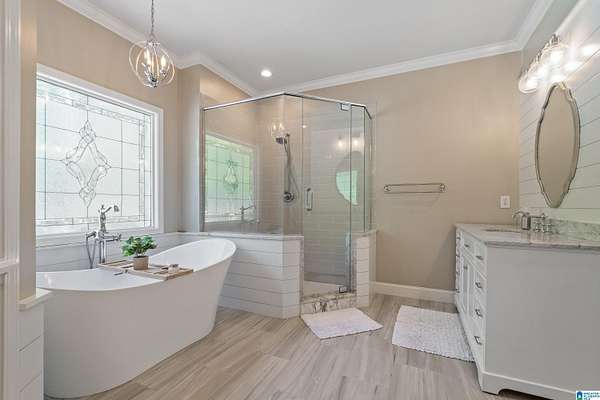 - Garden Tub, Home Theater, Linen Closet, Recess Lighting, Separate Shower, Separate Vanities, Shared Bath, Tub/Shower Combo, Walk-In Closets, Wet Bar