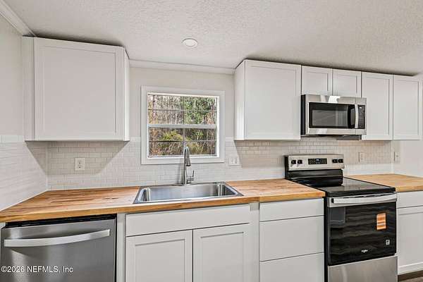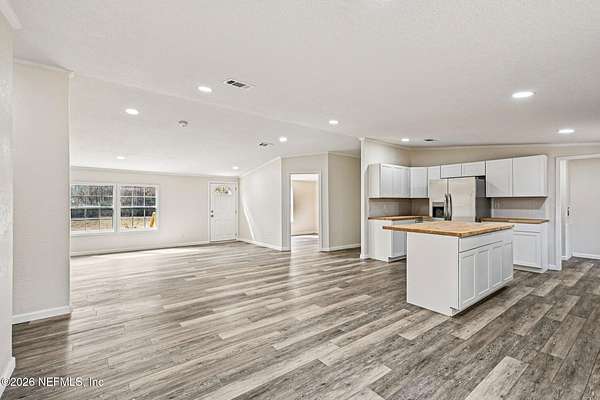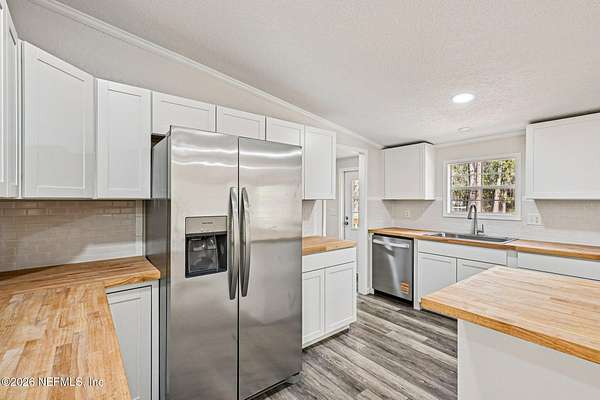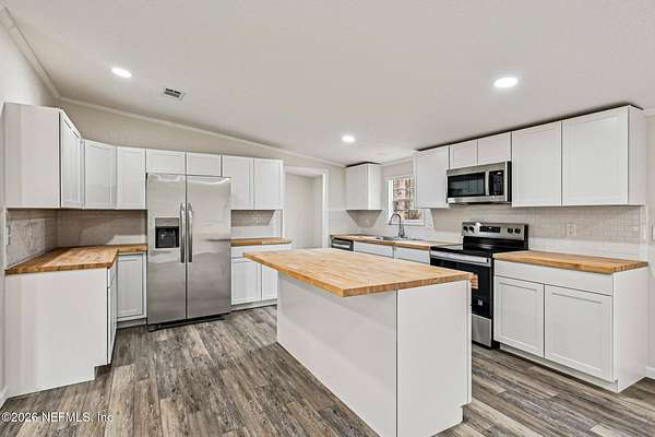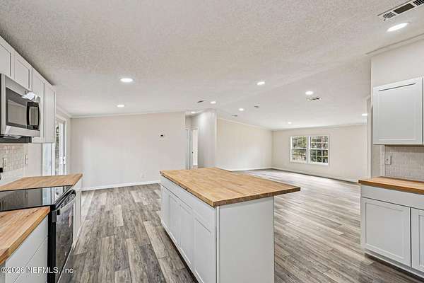 Welcome to 4938 Basil Street in Middleburg -- where modern updates meet peaceful Florida living. This fully remodeled 3 bedroom, 2 bathroom home offers the perfect blend of style, function, and space. Step inside to an open floor plan designed for gathering and everyday comfort. The beautifully updated kitchen features brand-new cabinetry, stunning butcher block countertops, and a large center island ideal for meal prep, casual dining, or hosting friends and family. Need flexibility? You've got it. A separate office space provides the perfect work-from-home setup, homeschool room, hobby space, or quiet retreat. Out front, a spacious deck invites you in and creates the perfect spot for morning coffee or winding down in the evenings. Out back, the yard stretches beyond the cleared area into the woods giving you privacy, room to explore, and that true Middleburg feel. If you're looking for move-in ready with charm, upgrades, and space to breathe this is it.