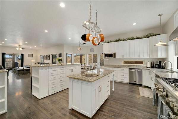 The chef’s kitchen is a masterpiece with three islands, featuring a 48” professional Monogram range, and Thermador range hood, new refrigerator, and dual dishwashers, paired with beautifully refreshed cabinetry, granite counters, perfect for entertaining or everyday living.