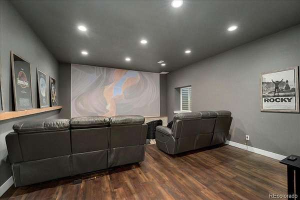 The finished basement is a private entertainment haven, boasting a soundproof theater with a 168” 4K projector and surround sound, a custom wine cellar, and a full bar with 50-lb ice maker and mini fridge. A 69-gun safe in the storage room stays with the home. Home is hardwired with Starlink for internet.