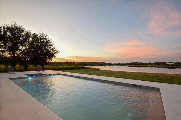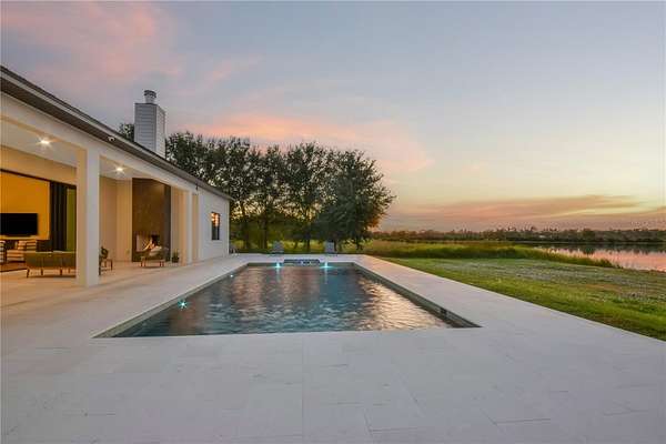 The outdoor living experience is truly exceptional. A stunning lanai features a real wood-burning fireplace and overlooks a fully automated heated pool and spa. Beyond the pool lies approximately 500 feet of deeded water frontage along a breathtaking, considerably deep 48-acre lake. This rare body of water is ideal not only for boating, jet skis, and fishing but is also perfectly suited for seaplane access. You can build your own private dock and enjoy the unparalleled beauty and freedom of true lakefront living.
