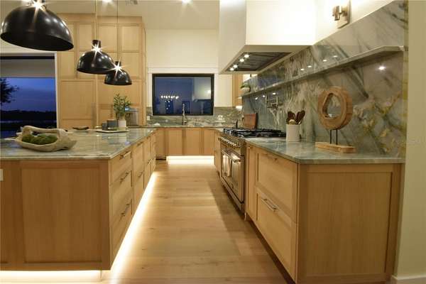The chef's kitchen is a true centerpiece of the home, curated for both beauty and performance. It features premium appliances, including a 48-inch gas range with hood and pot filler, a Sub-Zero refrigerator and freezer, and a dedicated hot beverage station. Solid wood cabinetry is enhanced with soft LED accent lighting at the kick plates and beneath the upper cabinets, adding a warm and luxurious glow. A spacious walk-through pantry with its own sink provides added convenience and exceptional functionality.