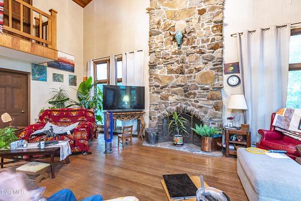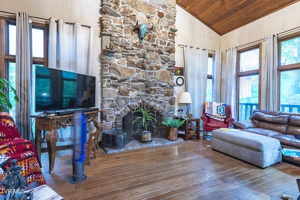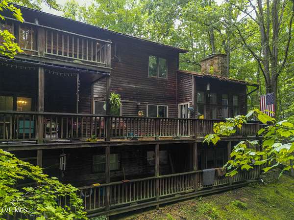 PRICE IMPROVEMENT Wood siding , metal roof. 3 heat pumps ( age unknown) . Italian tile and hardwood floors compliment this beautiful home. Upstairs is the master suite , with a jacuzzi tub and library area. The main floor has a large dining area, with an open deck to step out onto and enjoy the gorgeous surroundings. 9 ft ceilings in the kitchen , with recessed lighting, ceiling fan and tile backsplash. Newer countertops, refrigerator and gas stove. Reverse osmosis set up for water filtration. Some windows in kitchen have been replaced, as well as some deck boards. Some areas of fresh paint. Some new screen doors. Living room with stone fireplace and 18 ft. ceilings. All new toilets in 2023. Metal roof is approx 15yrs old and has copper downspouts . Main level with a beautifully tiled entryway , where you can step out to an enclosed concrete patio with built in fire pit and the 2 car garage. Lower level has a large den type area with another fireplace, large areas of storage and a full bath. New water heater in 2023. There is also a 2nd water heater in the laundry room that is not hooked up. Laundry room is also on the lower level. A cute as can be cottage sits a few steps from the home, ready to be finished. Home sits on a large flat area with plenty of room for parking . There is also a large woodshed on the property. Entrance off the main road is entirely paved all the way to the home, with stone column entrance to the property. Needs some TLC , Live like you are on vacation at your mountain retreat 24/7!! Privacy ,views and a breath of fresh air can be found here. Call ME and LET'S GO SEE!!