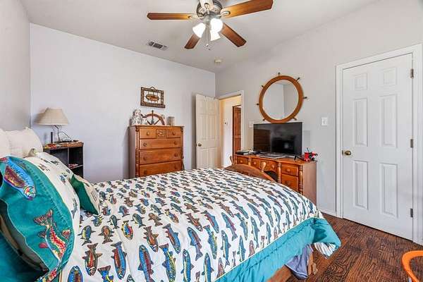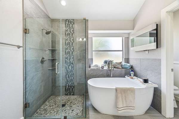 The ranch style home boasts an updated kitchen in 2012 with stainless steel appliances and granite counters. Soaring ceilings and matching wood blinds add warmth and style. Enjoy spacious walk-in closets and a showstopping primary bath remodel in 2023 featuring quartz countertops, an open walk-in shower, and a separate soaking tub. The secondary bedroom is generously sized and offers flexibility for guests or office space.