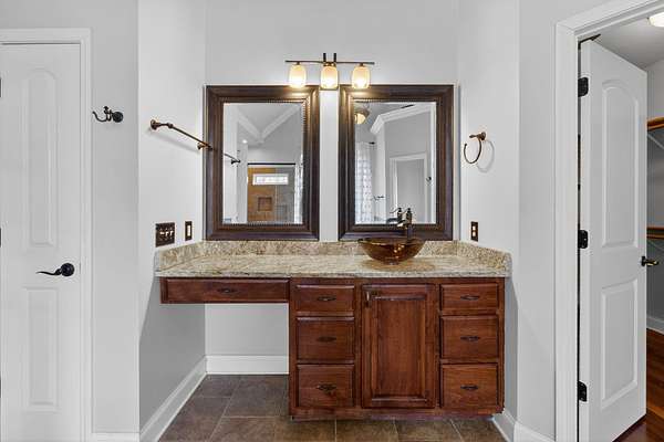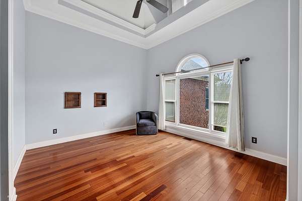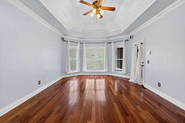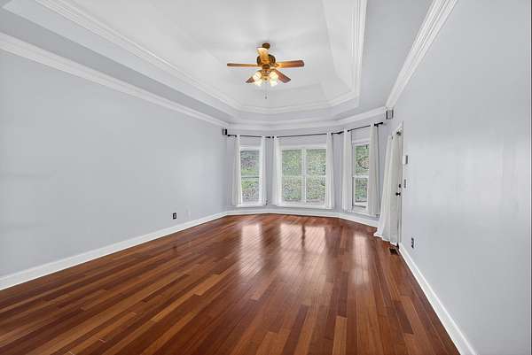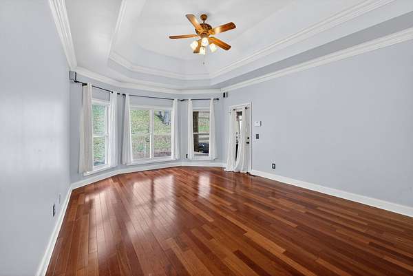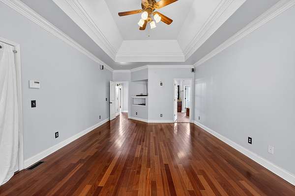 The spacious primary suite showcases a trey ceiling, large walk-in closet, and a luxurious bath complete with dual vanities (including a seated vanity space), soaking tub, glass and tile walk-in shower, and separate toilet closet.