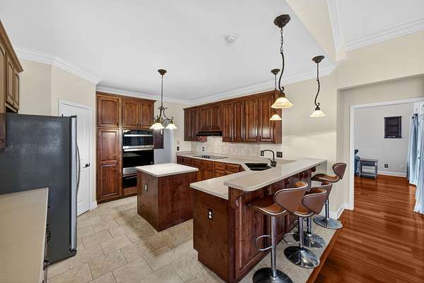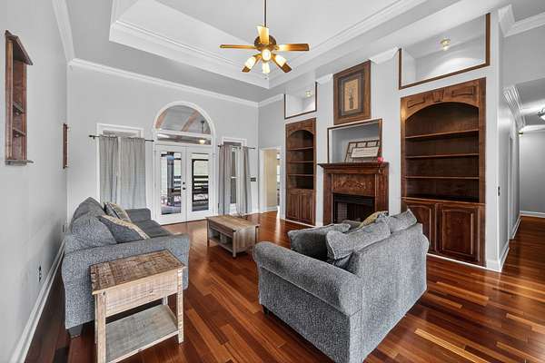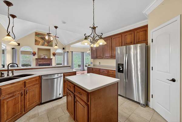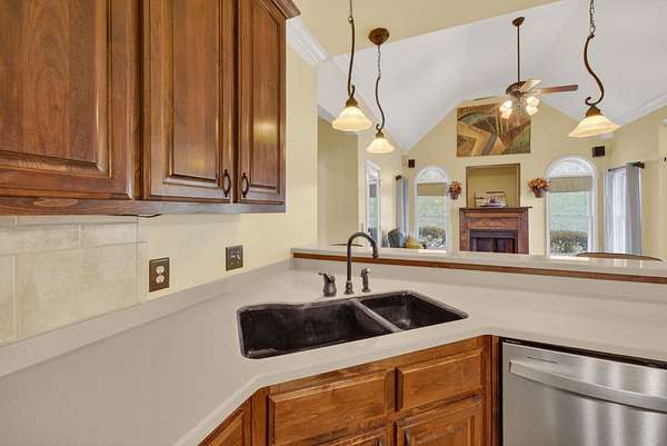 Inside, the open floor plan features high ceilings, beautiful trim and millwork, and hardwood and tile throughout the main level. Two fireplaces anchor both the main living room and the separate den, creating warm and inviting gathering spaces. The kitchen is equipped with new stainless steel appliances and flows seamlessly into the living areas—ideal for everyday living and hosting.