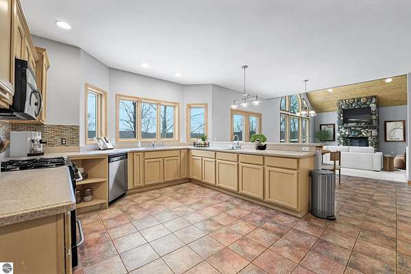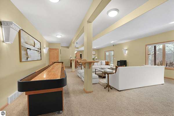 Nestled in a tranquil, treehouse-like setting on 1.6 acres, this 4-bedroom, 3.5-bath home in Truax Lake captures the essence of Up North living. This neighborhood enjoys a private access point to the Pere Marquette State Forest, with thousands of miles of scenic trails for hiking, biking, and year-round recreation. Step inside to vaulted ceilings and an open concept living space anchored by a floor-to-ceiling river stone fireplace. The spacious kitchen is well-appointed with solid wood cabinetry, natural stone countertops, stainless steel appliances, and picturesque views of the tree-lined backyard. The elevated deck spans the length of the home, overlooking the woodland canopy views. A cozy three seasons porch, wrapped in knotty pine, invites you to relax amidst the forested surroundings throughout the year. The primary bedroom features private deck access, walk-in closet and an ensuite bath with a dual vanity, jetted tub, and walk-in shower. Two additional bedrooms, a full bathroom, powder room, and laundry room complete this floor - offering the ease of single-level living. The walk-out lower level provides a large recreation room, bar area, guest bedroom, full bathroom, and an additional 1,225 sq. ft. of storage space. A landscaped backyard with a flagstone path leads to a fire pit, perfect for gathering under the stars and enjoying the peaceful Northern Michigan nights.