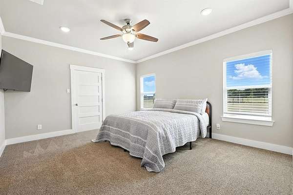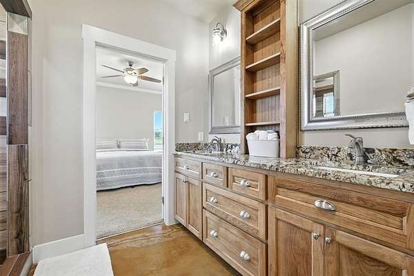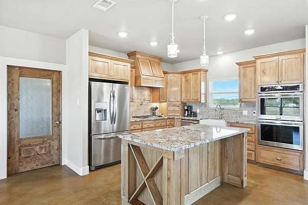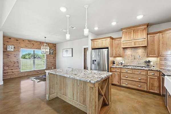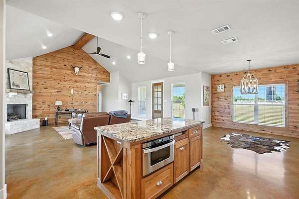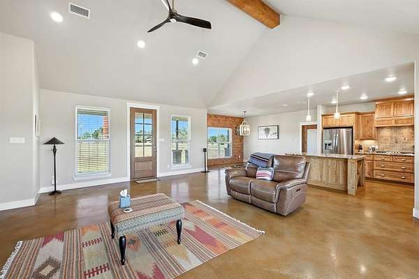 Preferred lender offering up to 1% of loan value in credits to buyer. Beautiful ranch-style home on 10 ag-exempt acres with no restrictions and no HOA! This well-maintained property is fenced and ready for livestock, offering the perfect blend of peaceful country living with city conveniences just minutes away. The spacious open floor plan is filled with natural light and features stunning wood beam accents in the living area. The kitchen includes custom cabinetry, granite countertops, and a large island--ideal for both everyday living and entertaining. The primary bedroom offers views of the property and a beautiful en-suite bath with rock-style finishes in the shower and ample storage. Outside, enjoy quiet mornings or Texas sunsets on the oversized covered porches. The 30x40 workshop is wired for welding, includes two RV hookups, has it's own electricity, and provides plenty of space for storage. Whether you're looking for a place to spread out, raise animals, or simply enjoy the outdoors - this property has it all!