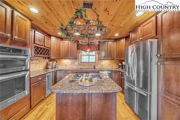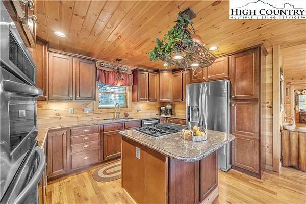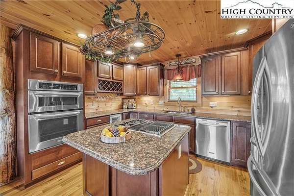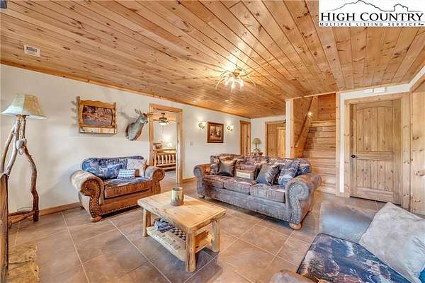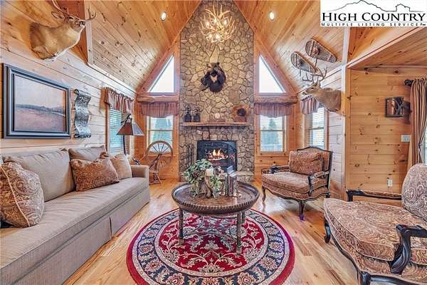 Nestled on 10 serene acres, this stunning log home offers the ideal balance of rustic charm and modern convenience. Spread across three spacious levels, the home welcomes you with an open-concept living room, highlighted by a dramatic stone fireplace soaring to the second level and floor-to-ceiling picture windows that capture breathtaking views. The main level features a master en-suite with a walk-in closet and French doors opening to the deck, as well as a chef's kitchen complete with granite countertops, a large island, custom cabinetry, and stainless steel appliances including a gas range, wine cooler, wall oven, and microwave hood. The dining area also offers French doors leading to the deck, alongside a welcoming foyer and convenient half bath. Upstairs, you will find two spacious bedrooms with cozy nooks and walk-in closets, a full bathroom, and a loft overlooking the great room and impressive stone fireplace. The lower level expands the living space with a large bonus living room, featuring another stone fireplace, a bar and game room that opens to the covered deck, a full bath, laundry room, and an additional bedroom with French doors and a walk-in closet. Ample storage is available throughout the home. Outdoor living is equally impressive with expansive multi-level decks, a separate covered deck, featuring a custom stone firepit, and separate entertainment areas that make the property perfect for gatherings or quiet evenings. A large outbuilding provides excellent space for storage, a workshop, or equipment, with additional room for four-wheelers and recreational gear. With 10 rolling acres of natural beauty, this property offers endless possibilities for both relaxation and adventure. Combining timeless craftsmanship, modern amenities, and serene surroundings, this extraordinary log home retreat delivers a rare opportunity to enjoy both luxury and privacy in a truly spectacular setting.