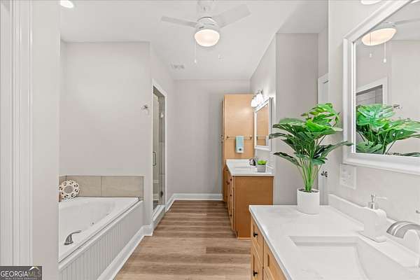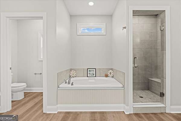 - Double Vanity, High Ceilings, Master On Main Level, Separate Shower, Soaking Tub, Split Bedroom Plan, Tile Bath, Tray Ceiling(s), Walk-In Closet(s)