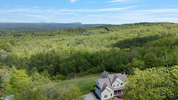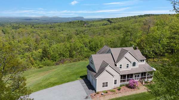 Awe-inspiring panoramic views from nearly every room of this custom-built home. Gourmet kitchen features Cherry cabinetry, granite counters, tile flooring, & a large center island. Enjoy morning coffee in the breakfast nook while taking in the incredible sunrise. The home's open layout includes a formal dining room, a screened farmer's porch, & a massive deck overlooking the East and Northeast -- perfect for entertaining or quiet reflection. The Cathedral-ceiling family room boasts built-ins and a stone-surrounded fireplace with a gas stove insert, creating a cozy yet grand atmosphere. A private office/den completes the main floor. Upstairs, the primary suite features a massive walk-in closet and a luxurious en-suite bath. Two additional bedrooms, a 2nd full bath, and 2nd-floor laundry add convenience. The finished walkout lower level offers over 1,000 sq. ft. of space, including the fourth bedroom, a 4th bath, a rec room (pool table included!), and storage and this space could easily become a nice in-law/ADU, perhaps?. The home has a dual heating system with an outdoor wood boiler and FHA propane with central air. A paved circular driveway leads to the attached garage and the 28' x 40' heated barn/garage with a lift & power - perfect for projects. GPS sometimes sends you the LONG Way! It's barely 10 minutes from 101 in Milford. At Mkt Bskt/Zizza pizza intersection, go straight onto N River Rd, Left at the Fitch's Farm and follow all the way to Mountain RD, home on Rt.