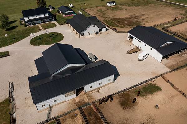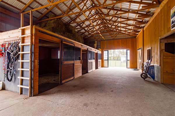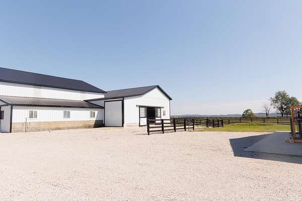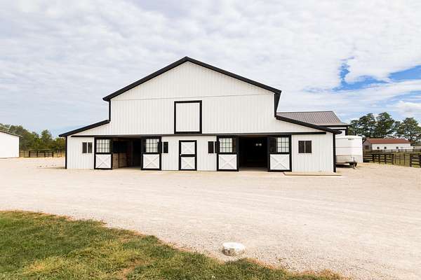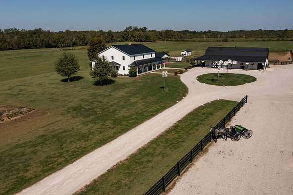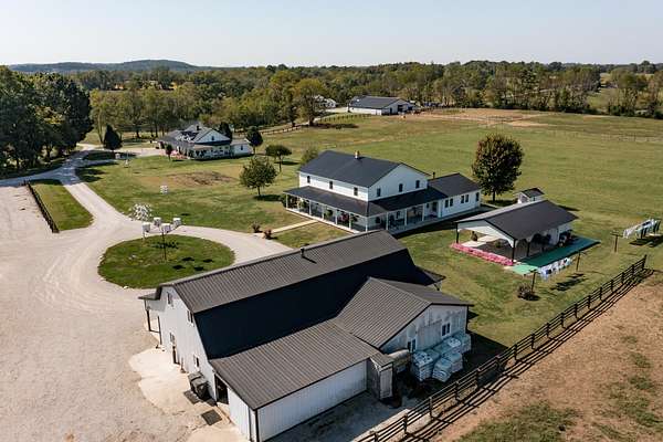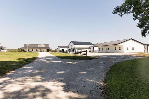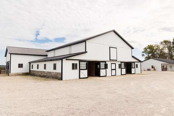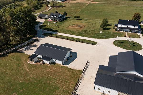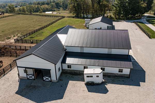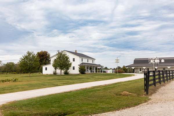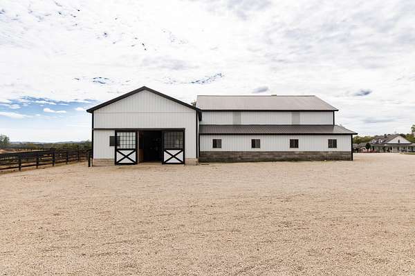 Welcome to a rare and remarkable property that combines country luxury, equestrian excellence, and business potential all in one stunning package. Situated on 41.35 fully fenced acres, this beautiful horse farm offers everything you need for refined country living, serious horse training, or a multi-family living opportunity. The land features seven paddocks/lots and a large field with a training track around the perimeter, along with the ability to grow your own hay, a self-sustaining setup designed for equine enthusiasts. A spring-fed pond stocked with largemouth bass adds to the charm and functionality of this exceptional estate. The home is a classic two-story farmhouse boasting over 4,700 square feet of finished living space plus a poured concrete partial basement. Wraparound porches frame breathtaking views of rolling hills, perfect for taking in both sunrise and sunset. Additional property highlights include a barndominium with guest quarters, horse stables, a multi-purpose barn, a dedicated business building, and a pavilion designed for entertaining, all fully integrated for either private use or a turnkey business operation. With its panoramic vistas, premium facilities, and unmatched versatility, this property is truly a dream come true for horse lovers, entrepreneurs, and families alike. Whether you're looking to run a horse or agricultural business, create a private retreat, or live off the grid, this farm delivers limitless opportunity. Experience a lifestyle where beauty, productivity, and opportunity meet. This is more than a farm, it's a legacy waiting to be continued.