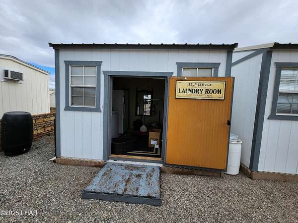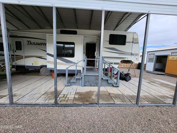 RV lot in Rainbow Acres with 2-50 amp full hookups, 40' X 18' RV cover and 51' X 24' RV cover, 2 sheds. 1 shed has laundry hookups and fridge and the appliances are included. The other shed has been used as the group dining area and also makes for good storage. No front wall or gates for ease of maneuverability for your rigs. Mature Palo Verde tree for shade. Both the 5th wheel and the trailer are available outside of escrow or will be removed. This lot was loved and enjoyed for years, now it's your turn!