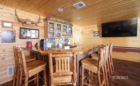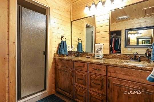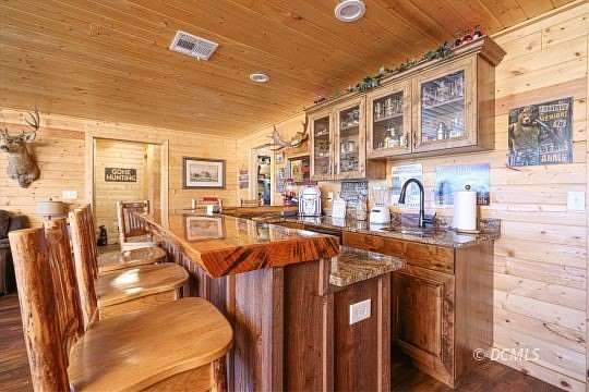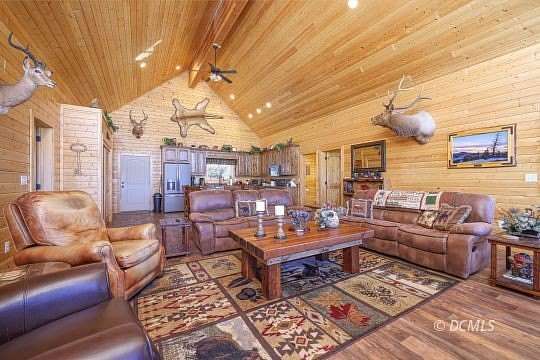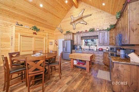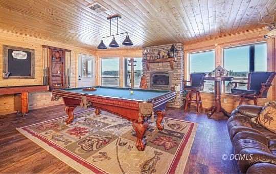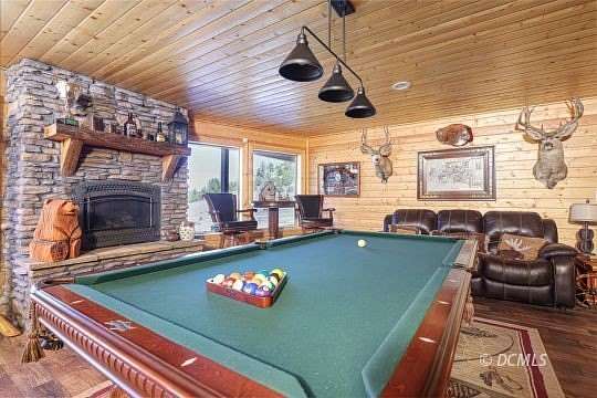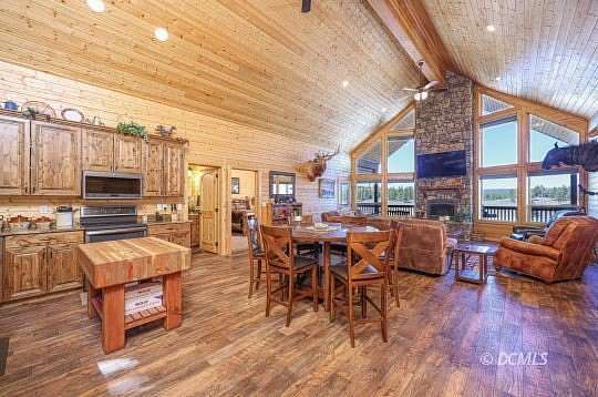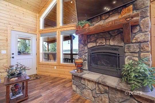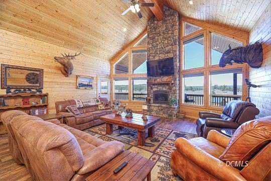 Beautiful 2,888 sq ft, 4-bedroom, 3.5-bath home delivers generous space paired with sweeping valley views. Seamless indoor-outdoor living shines through expansive decks and patios overlooking the Marksaguant Plateau. A deck just off the kitchen creates an ideal setting for al fresco dining or evenings under the stars. An inviting layout includes two main-level en-suite bedrooms, each with attached baths and access to a covered deck. Vaulted ceilings elevate the open main-level great room, anchored by a striking full-wall rock propane fireplace with custom mantle. Hand-hewn vinyl plank flooring flows throughout the main level, while a dramatic window wall captures tranquil mountain views. The gourmet kitchen features high-quality stainless steel appliances, custom wood cabinetry, granite countertops, and a pantry. Lower-level living offers a cool and comfortable retreat with two additional guest bedrooms, a full bath, a dedicated laundry room, and a full-service wet bar. A spacious family room with a pool table and fireplace provides the perfect gathering space for entertaining or relaxing. An attached garage is complemented by a detached two-car garage, offering ample storage.
