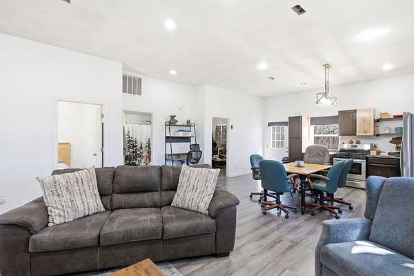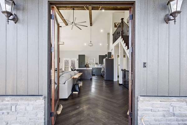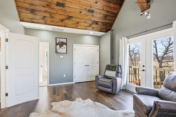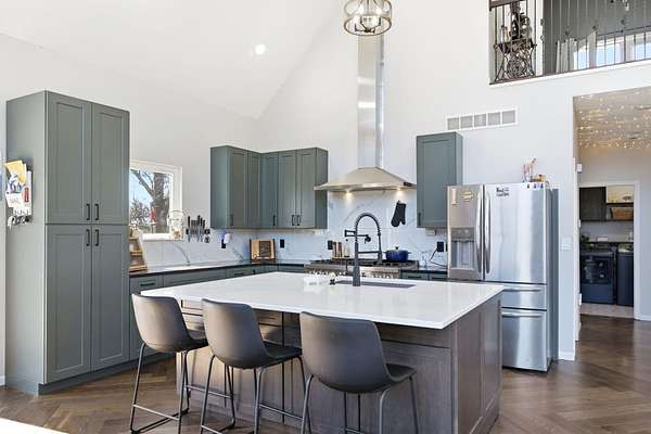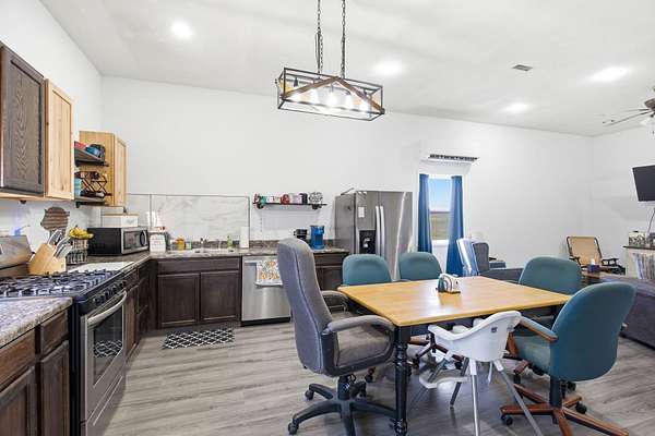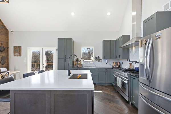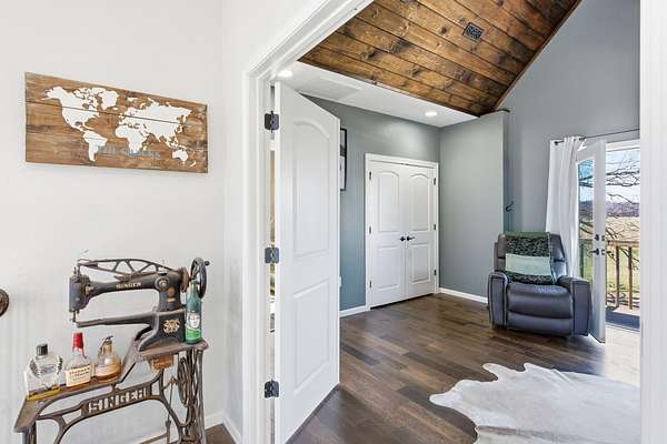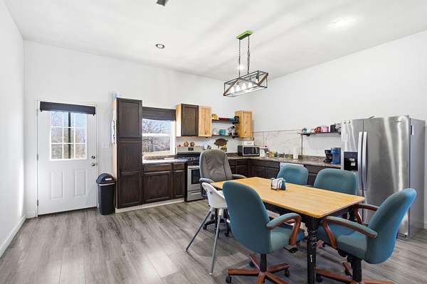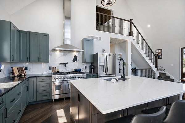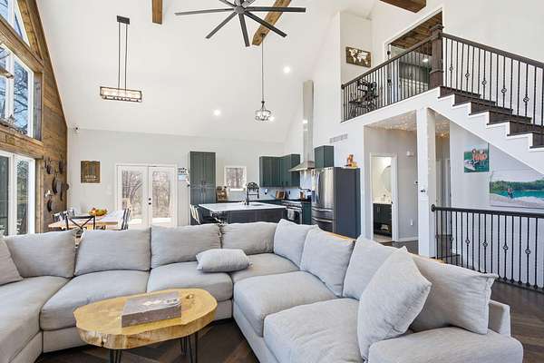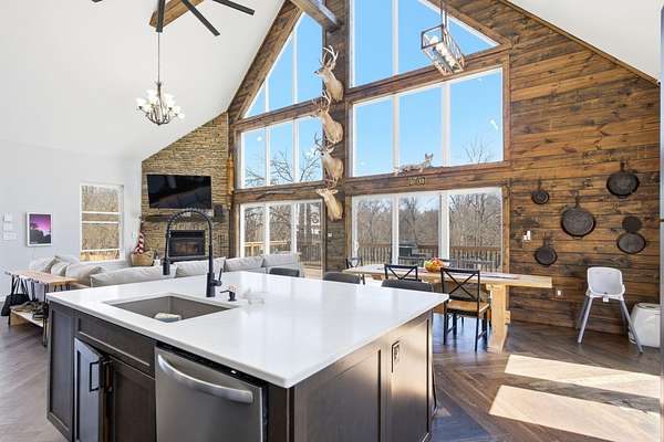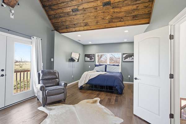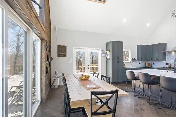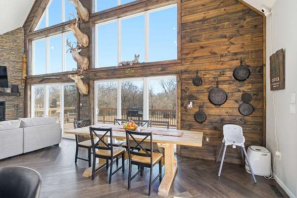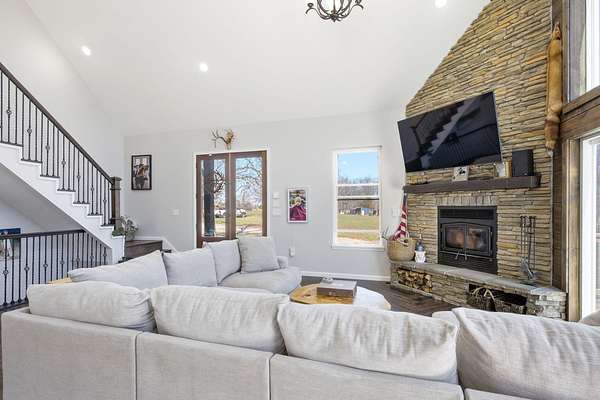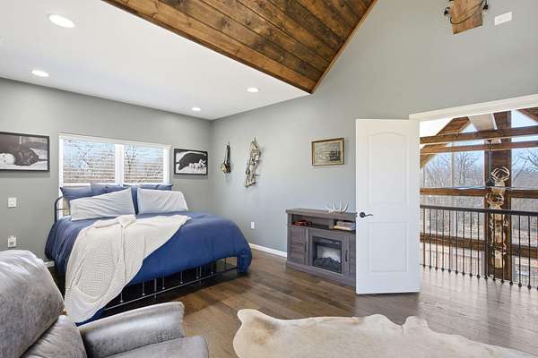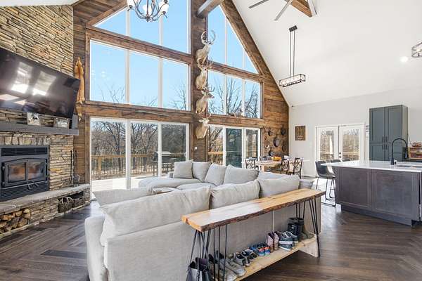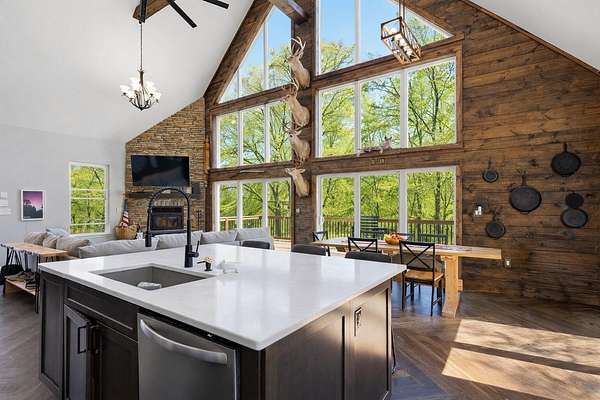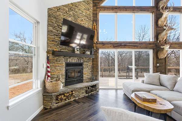 The main level features a stunning open-concept design highlighted by a grand living room with soaring 26-foot ceilings and a wood-burning fireplace, creating a warm yet impressive focal point. The chef's kitchen is beautifully appointed with granite countertops, a custom quartz island, stainless steel appliances, a gas range with pot filler, and abundant custom cabinetry. The adjoining dining area offers seamless access to the wraparound deck! Also on the main level are two spacious bedrooms, a full bathroom, and a well-positioned laundry room for added convenience. The upper level serves as a private primary suite retreat, complete with double closets, a spa-like bathroom featuring a oversizes tiled walk-in shower, and exclusive access to a private balcony (think morning coffee!!). The walk-out lower level provides additional living space with a generous family room, two bedrooms, and a full bathroom. The 30x30 shop with finished living quarters, featuring a kitchenette, full bathroom, mini-split system, and furnace. (Rental or In-law Suite Opportunity). This remarkable property offers a rare blend of refined living, privacy, and natural beauty with versatile use potential! Check it out!!