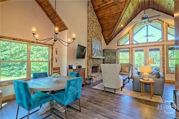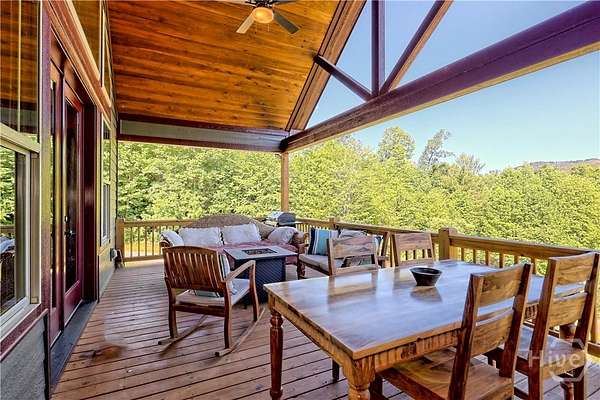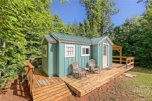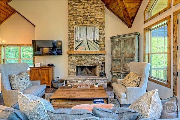 Welcome to the Fox Den Haven, your fully furnished and turnkey serene mountain escape! Nestled on over 3 private wooded acres conveniently located near La Prades at Lake Burton. This 4-bedroom, 3-bath cabin feels like a treehouse in the treetops, surrounded by lush green foliage in spring and summer and a stunning display of color in the fall. Designed for both personal enjoyment and short-term rental success, the home features vaulted ceilings, a stacked-stone fireplace, and an open-concept living and dining area filled with natural light. The kitchen is fully equipped and flows seamlessly for entertaining larger groups. The main-level primary suite offers a spacious ensuite bath with double vanities, soaking tub, and walk-in shower. Additional bedrooms provide generous space and privacy for guests. The basement was recently completed (2024) which added two additional bedrooms, bathroom, wet bar and family room/game room combo. There is an additional "shed" structure on the property that has a full bath, kitchenette, covered deck and mini-split - perfect as a separate office or artist studio. Outdoor living is a highlight with a wonderful outdoor deck offering beautiful views. The patio below features a hot tub, and swing. Ample parking and smart-lock entry enhance convenience. Located between Clayton and Helen, with easy access to boating, hiking, dining, wineries, and year-round outdoor recreation. The home is zoned 'Vacation Cottage' and has a healthy rental history and five-star reviews on rental platforms. The owner is a licensed RE agent in the state of GA.