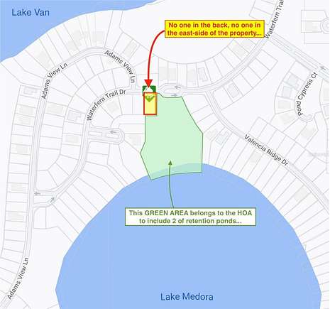 Back on the Market... MOTIVATED SELLER. Looking for PRIVACY? ALMOST A LAKE FRONT LOT. This is NOT an interior lot, do not be fooled by low prices on other lots if you are looking for privacy and unobstructed lake views (Lake Medora and 2 ponds). NO neighbor on the east side and NONE in the back for maximum privacy. Partial view of Lake Van from the front. Bring your builder and build your dream home. Community has several Tennis & Basketball Courts, 3 pools, an impressive club house and fitness center including 2 saunas, 2 boat ramps to access Lake Van & Lake Alfred, and more, much more. This lot has Impact Fees partially paid, you could be saving between $5K to $9K.