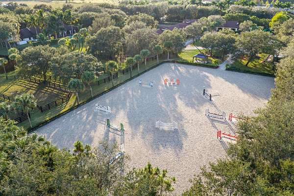 Set on 10 pristine acres, this professionally designed, championship-caliber equestrian estate delivers an exceptional blend of luxury, functionality, and top-tier performance. Purpose-built for serious equestrians, the property features a meticulously planned 30-stall barn, with each 12' x 12' stall outfitted with fans, windows, automatic water, spigots, hurricane shutters, and an integrated fly spray system-ensuring optimal comfort, safety, and efficiency year-round. The barn is thoughtfully designed with a stunning center aisle finished in Equitan rubber flooring and offers outstanding amenities, including two full bathrooms with showers, ten dedicated tack-up areas, three separate tack rooms, and three feed rooms equipped with washers and dryers. The facility is fully supported by Wi-Fi and a generator, providing seamless operation and peace of mind. The professionally appointed riding arena measures approximately 250' x 145' and features an advanced ebb-and-flow system with premium footing, delivering consistent, competition-ready conditions. Additional training and support amenities include a six-horse walker, round pen, six wash stalls, and twelve individual turnout paddocks. The property also offers three RV parking spaces with full hookups, along with an expansive parking area accommodating both vehicles and horse trailers. Completing the estate is a beautifully appointed four-bedroom residence, offering a private retreat with a resort-style poolperfectly balancing refined living with a world-class equestrian lifestyle.