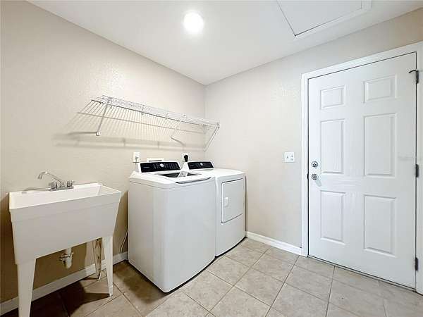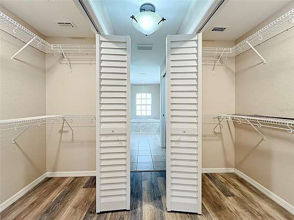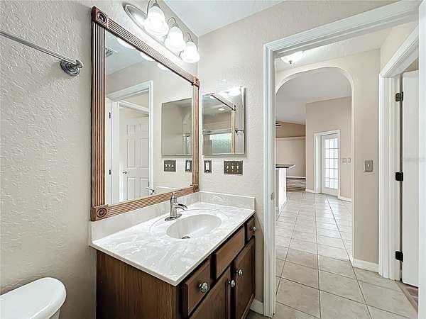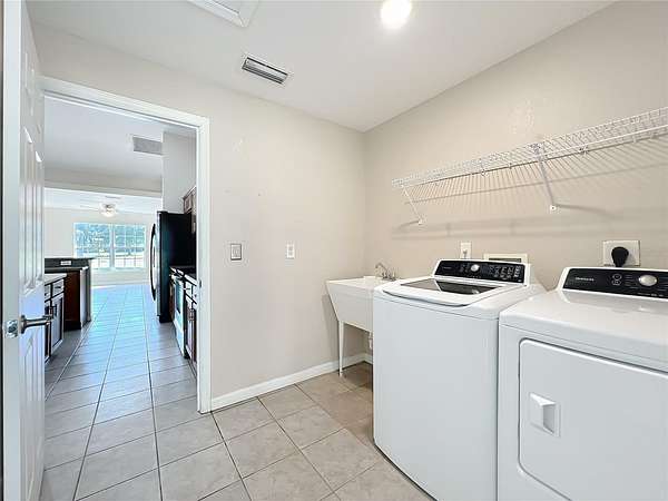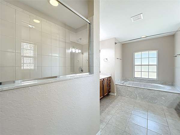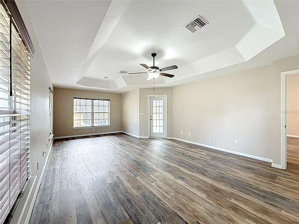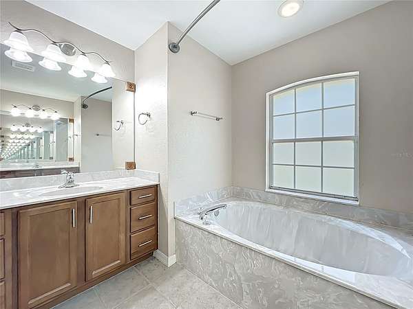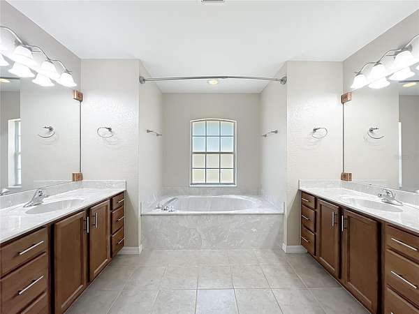 The split floor plan offers privacy and flow, with a generously sized primary suite featuring a tray ceiling, sitting area, and direct access to a screened lanai. The ensuite bath includes his-and-her closets, dual vanities, a garden tub, and separate shower.