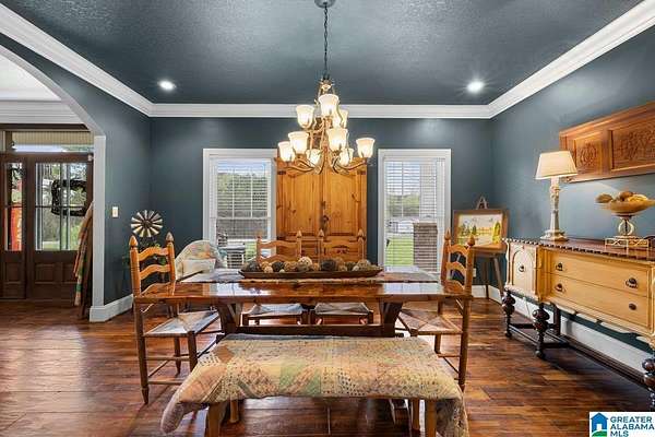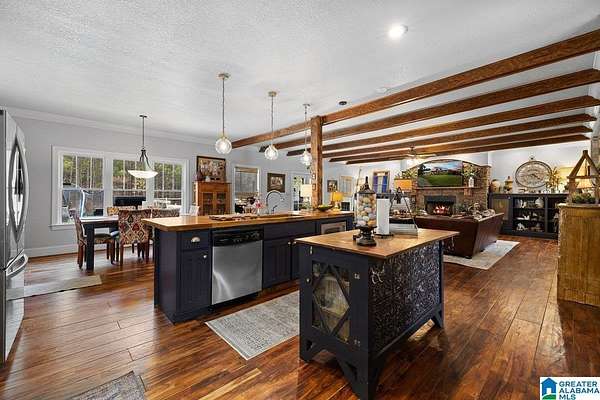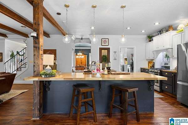 Est $2,936/mofireplace with beautiful custom book shelves. The kitchen and living area are all open with lots of natural light. The kitchen has custom cabinets with a 10 ft butcher block island with a walk in pantry. There is room for a 8 ft farm house table in the kitchen as well as a spacious laundry room. The formal dining room is off the foyer with crown molding thru out. The primary bedroom is large with an equally as large bathroom and closet. There are 2 bedrooms upstairs each with there own full bath and walk in closets.