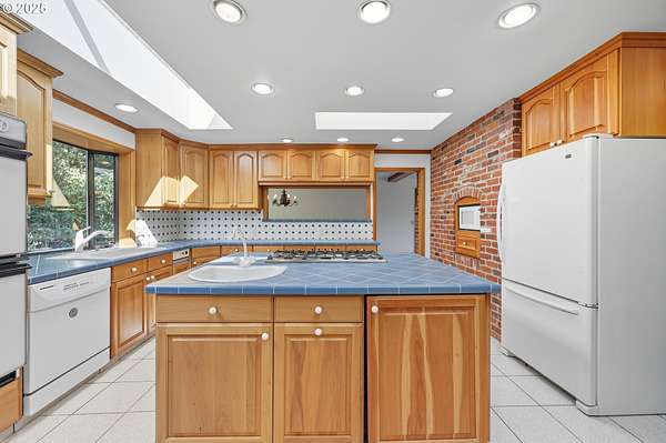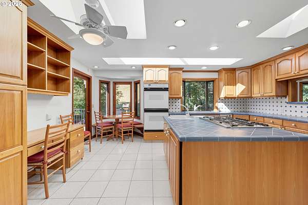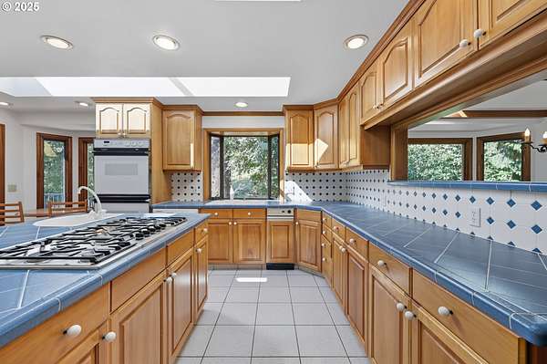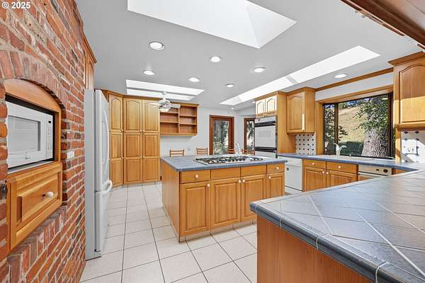 - Builtin Oven, Builtin Range, Convection Oven, Cooktop, Dishwasher, Disposal, Double Oven, Free Standing Gas Range, Free Standing Refrigerator, Gas Appliances, Island, Tile, Trash Compactor, Wine Cooler