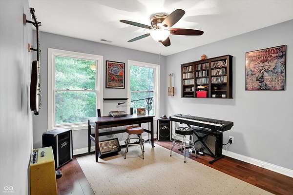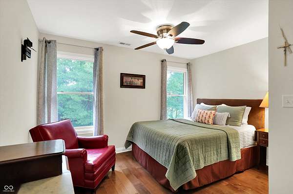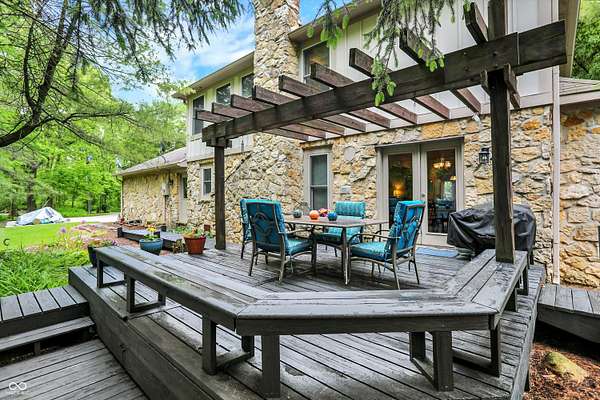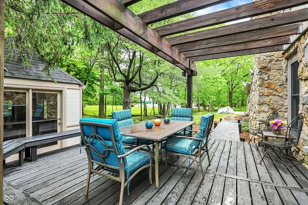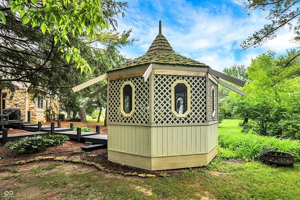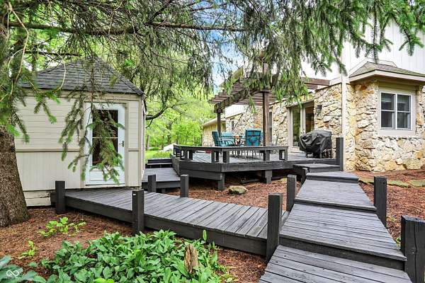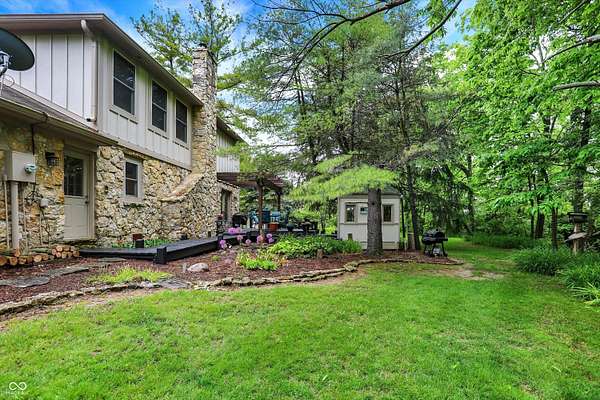 Nestled on 4.5 picturesque acres, this wonderful 3-bedroom, 2.5-bath home offers a tranquil retreat surrounded by mature trees and a winding creek. Hardwood floors flow throughout the main and upper levels, lending warmth and character to every room. The main level welcomes you with an inviting family room anchored by a unique stone fireplace with high-efficiency wood burning insert that heats the entire main level, a spacious kitchen with large center island, and a dining room wrapped in a wall of windows that bring the outdoors in. The open floor plan provides the ideal space for entertaining family and friends. Upstairs, the spacious master suite features an en-suite bath with double vanities, granite countertops, a tiled shower, and a large walk-in closet. Two additional generously sized bedrooms complete the upper level. Step outside onto the expansive deck, where you'll be surrounded by the beauty of mature trees. A charming koi pond adds to the serenity, while a quaint gazebo invites you to sit back and relax. The 36' x 26' pole barn offers plenty of space for recreational vehicles and extra storage.(2) 14' doors and 30 AMP RV plug in allow for your largest toys! Also on the property, a delightful cottage could serve as the perfect greenhouse or a whimsical children's playhouse. Wander the trails that wind through open fields, beneath the canopy of old-growth trees, and along the gentle flow of the creek-an idyllic setting for those who appreciate nature, privacy, and the comforts of home.