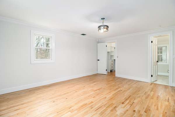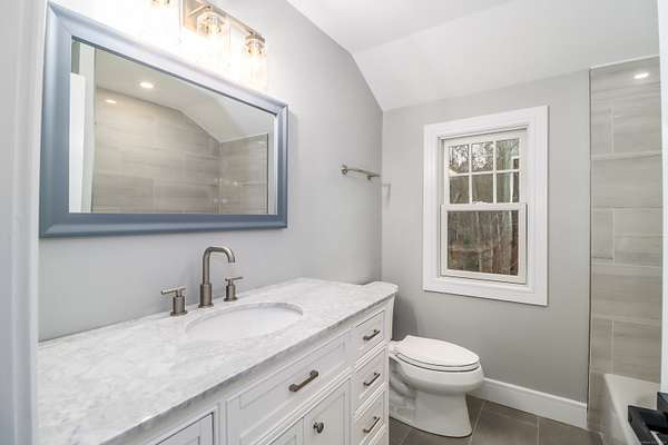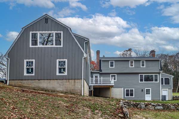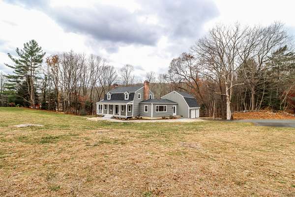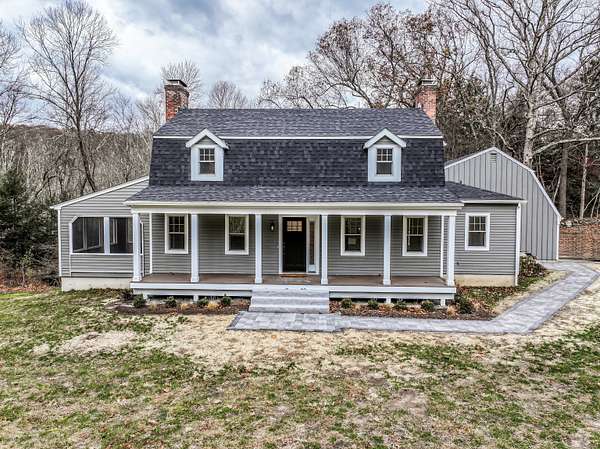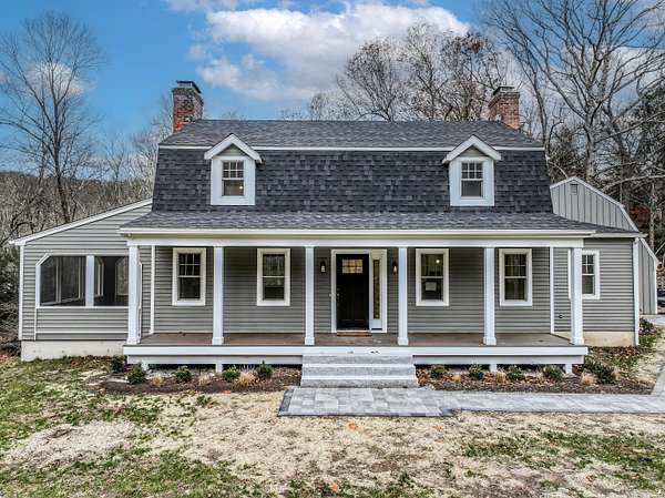 Reimagined from floor to ceiling in 2025, this quintessential New England colonial is better than new. Set on 2 acres, it showcases a timeless gambrel roofline and an inviting front porch (built brand new from the ground up) that spans the length of the home. All landscaping, walkways, & stunning granite steps were newly installed, creating a fresh and welcoming approach. Inside, one of the most compelling features is the home's flexible layout, offering a half-story bonus room with a rear entrance and full bathroom; an ideal optional fourth-bedroom suite, private office wing, or playroom. Throughout the home you'll find new Andersen windows, new hardwood flooring, all-new electrical, & a hydro-air HVAC system, creating a truly turnkey living experience. The eat-in kitchen is a standout, designed with crisp white cabinetry, a deep navy island, quartz countertops, GE stainless-steel appliances, a custom sliding barn door to the pantry, and a glass-tile backsplash that adds a clean, contemporary edge. With direct access to both the dining room and the brand-new rear deck, it's an ideal layout for everyday living and casual gatherings. The screened porch is truly memorable. Complete with its own fireplace, it serves as an all-season haven surrounded by nature. Upstairs, the primary suite includes a walk-in closet and full bathroom. Two additional bedrooms share the hall bath. Each bathroom has been fully redesigned with dual vanities, tile surrounds, and designer-grade fixtures.