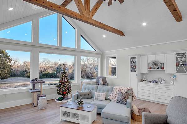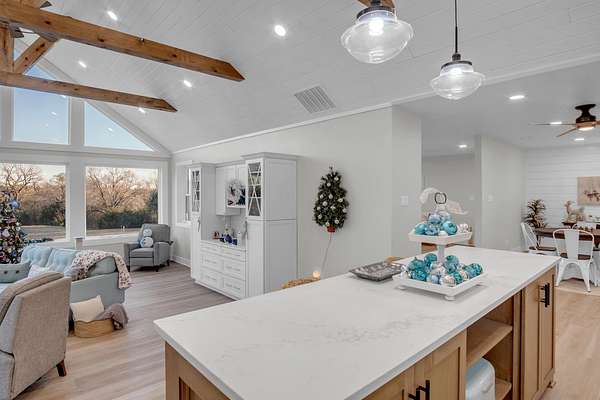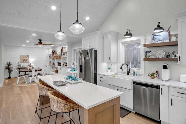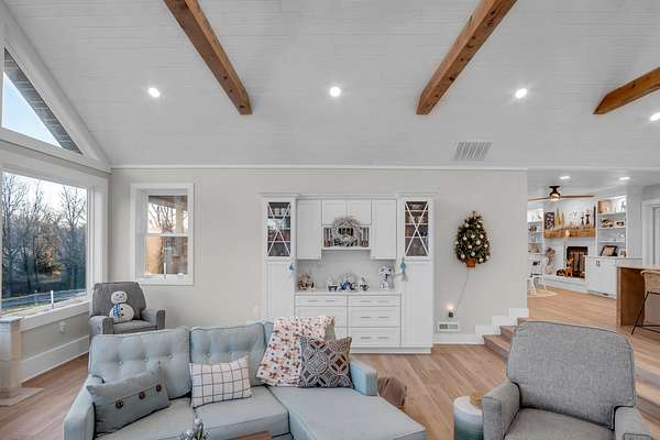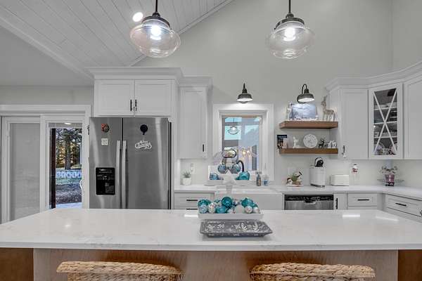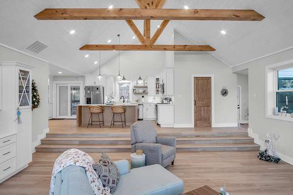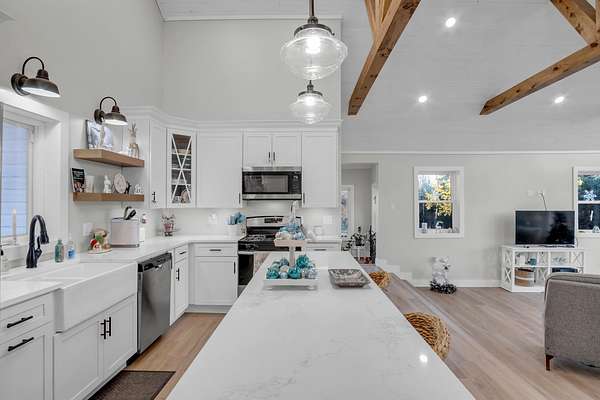 LAKEHOUSE LIFESTYLE at its BEST on Marion County Lake! Welcome to this fully renovated lake house retreat where every detail has been upgraded for modern comfort and peace of mind. Nestled on almost 2 serene acres at the lake with stunning water views, this home is your dream escape, whether it is for weekend getaways or full-time living. EVERYTHING is NEW: electrical, plumbing, siding, windows - SMART HVAC system & tankless water heater. The GENERAC whole-house generator adds the security of never being without power. The home features LVP flooring & quartz countertops throughout. All new kitchen appliances STAY with the home. Step into the gorgeous open living space with extra high vaulted ceilings in the family room/kitchen and large windows facing the lake (enjoy the view of the lake), flooding the home with natural light and unbeatable views. You will love the open layout of the kitchen/dining room with a wood burning fireplace, family room and the front living room. The primary suite is your private oasis, featuring a HUGE walk-in closet and a spacious bathroom you will love. Enjoy the thoughtfully designed laundry room with a pass-through grocery door from the oversized 3-car garage, which also includes a storm room and mini-split system for year-round comfort. Outside, relax on the covered deck or the stamped concrete patio, and do not miss the 32x40 insulated shop with a wood-burning stove plus a utility shed for all your gear. Above the garage is almost 800 square feet of unfinished space. Use your imagination and create a VRBO or apartment for extra income, extra bedrooms, game room, hobby/craft room, man cave or woman cave. The possibilities are endless. Use the extra acre to the West of the home for extra sheds/outbuildings, horse, chickens, or sheep - start your own little farm. All of this on a quiet road with easy access to the lake. This is not just a home... it is a lifestyle. Schedule your private tour today and experience lake life at its finest! Furniture is negotiable!