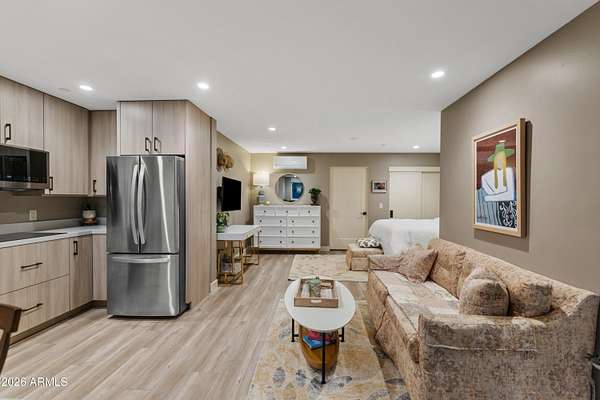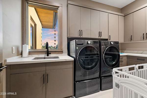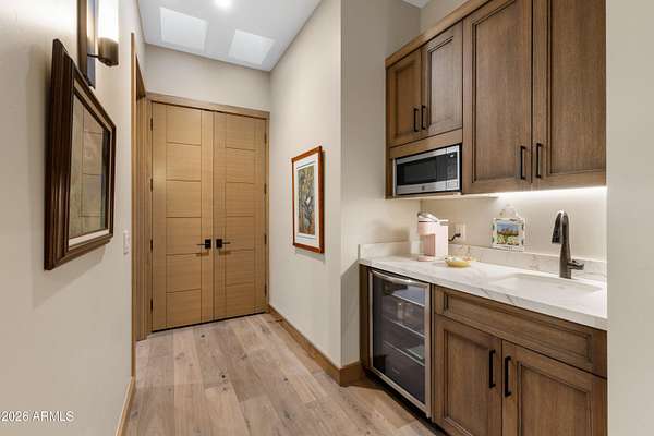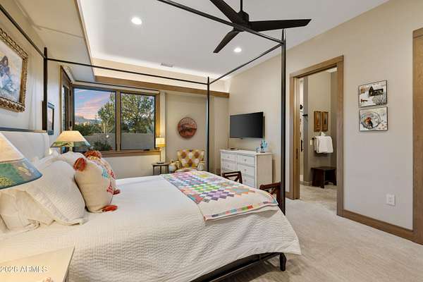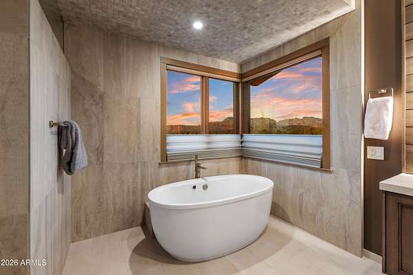 Tucked within the prestigious gated North Slopes community, this exceptional modern mission-style residence sits on more than two acres of natural forest, offering an extraordinary blend of privacy, views, and refined design. Completed in 2023, this single-level luxury home showcases thoughtful construction, high-end finishes, and extensive landscaping that together represent a tremendous investment of vision, craftsmanship, and detail. From the moment you step through the grand entry, the home immediately reveals its sense of space and light. Expansive windows frame sweeping views while clerestory windows fill the interior with beautiful north-facing natural light. The great room welcomes you with warmth and sophistication, centered around a hand-cut cream travertine and natural stone fireplace, with large sliding glass doors that seamlessly connect indoor living with the serene front courtyard or the immaculate backyard designed for entertaining and relaxation. The open layout flows effortlessly into the heart of the home -- a stunning kitchen featuring Taj Mahal quartz countertops and backsplash, a large island ideal for gathering, and a generous walk-in pantry. Home is also fitted with Hunter Douglas shades throughout that are all controlled via digital remote for clean and easy use. The design balances elegance and functionality, making everyday living as enjoyable as hosting guests. The home's split floor plan creates both privacy and versatility. A dedicated office offers a quiet and inspiring environment for work, study, or creative pursuits. The primary suite feels like a private retreat of its own, with ample living space, corner windows capturing canyon views, and a spa-inspired bathroom designed for comfort and relaxation. A custom walk-in closet completes this luxurious sanctuary. The guest wing is thoughtfully designed to provide comfort and independence for visiting family and friends. Two spacious bedrooms share a well-appointed bathroom and are complemented by a convenient coffee bar with sink and refrigerator, creating a welcoming suite that guests will truly appreciate. Adding even more flexibility, an additional oversized bedroom is currently configured as an office or fitness space. This bright and airy room enjoys incredible views, abundant natural light, private patio access, and its own full bathroom, making it perfect for a variety of uses. As if the main residence weren't impressive enough, the property also features a private lower-level apartment with its own entrance. Complete with a full kitchen, bathroom, and laundry, this space offers endless possibilities for extended family, guests, or a private retreat. Outdoor living is equally remarkable. The front courtyard is beautifully finished with travertine tile and a tranquil fountain, offering views toward Jerome Mountain, while the fully enclosed backyard provides a peaceful setting surrounded by nature. Mature landscaping and careful design create outdoor spaces that feel both luxurious and serene. (Don't forget to ask for the photo album of the backyard in full bloom!) Altogether, the home offers five potential bedrooms and four bathrooms, including the private apartment and flexible living spaces. Nearly new construction, single-level living, panoramic views, and extensive completed landscaping make this property a rare opportunity in one of Sedona's most sought-after communities. This is more than a home--it is a thoughtfully crafted retreat where privacy, beauty, and modern luxury come together in perfect harmony.