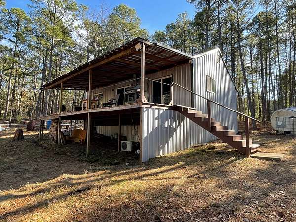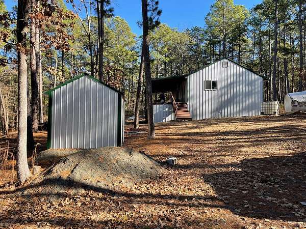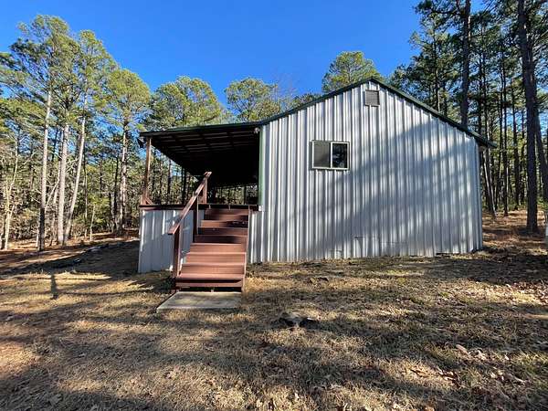 Come enjoy life in the Wilderness at Moondance Hideaway. This is a cozy 2 bedroom 2 bath 840 sqft. cabin with a large covered porch that overlooks the woods. Sitting on 2.5 acres in a peaceful area where the deer come to take a drink from the creek that meanders below. The cabin was built in 2021, a barndo look on the outside with steel siding and a steel roof. It is heated and cooled with forced air mini splits but there is also a wood stove in the living room for those cooler evenings. The kitchen is open and has plenty of counter space and cabinets with a stainless steel stove, microwave and a refrigerator. Plumbing is in place for a dishwasher in the kitchen but currently there is not one. A 50 gallon hot water heater with a Well and septic is in place and the cabin does have electricity. The well is located inside a shed that was also converted into a laundry room with a cement floor. The property is wooded with tall pines and is fairly level. Located in the Kiamichi Mountains of Moyers in a remote peaceful spot. This would make a nice vacation property or a full-time residence with all the amenities to live in the mountains and still have the comforts of home.