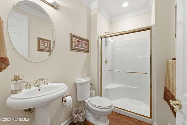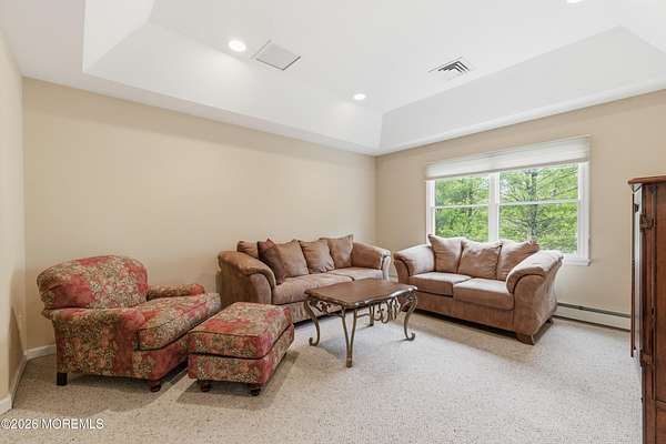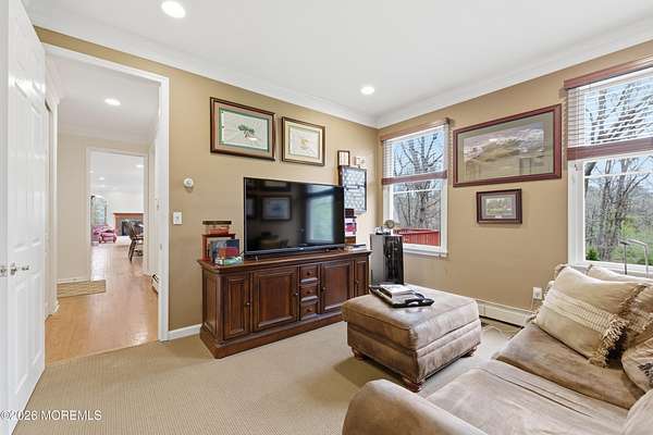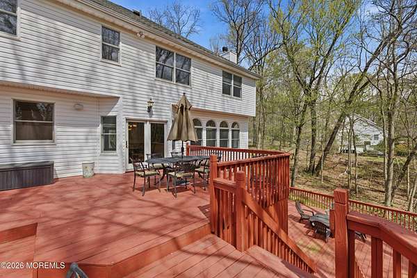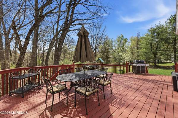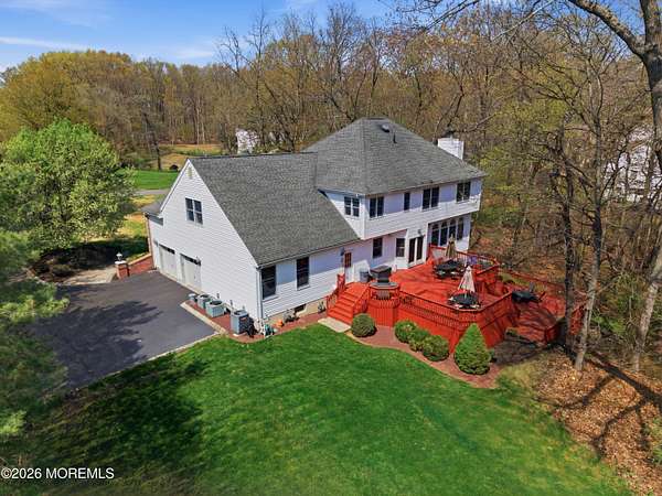 Welcome home to this gorgeous slice of serenity in Southern Manalapan's exclusive Highland Ridge development. From the picturesque drive past the lake to the quiet, tree-lined streets, you'll immediately feel the character and prestige of this outstanding location. Nestled on over two acres of beautifully wooded property, ''coming home'' truly feels special. This spacious home features 5 bedrooms, 3 full bathrooms, and more than 3,800 sq ft of living space on the first and second floors. A fully finished walk-out basement with radiant-heated floors adds another 1,000+ sq ft, creating an exceptionally generous layout. The open-concept family room flows seamlessly into the kitchen, both bathed in natural light from the large array of windows lining the rooms. A first-floor bedroom & full bath offers versatility--perfect for guests or a dedicated home office. Step outside to enjoy total privacy on the back deck, overlooking the serene wooded acreage. Upstairs, the primary suite impresses with vaulted ceilings, an en-suite bath, and a large sitting/dressing area with multiple walk-in closets--ideal for even the most extensive wardrobe. Three additional generously sized bedrooms and a guest bath complete the second floor. If privacy is what you're looking for, you've just found it. Cul- de sac block. Just 5 minutes from public transportation to NYC and shopping, with access to highly rated schools in the Manalapan/Freehold Regional High School District.
