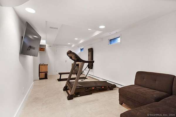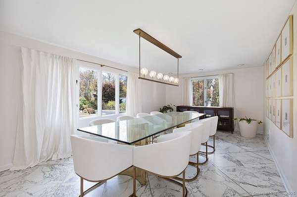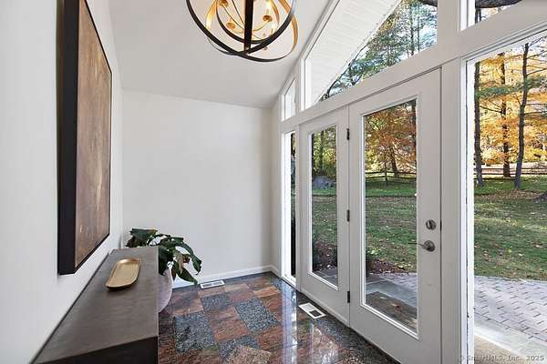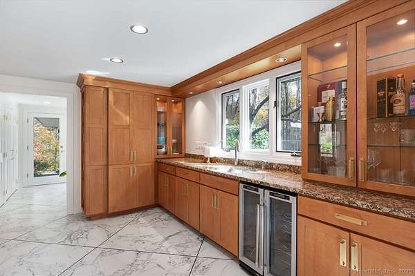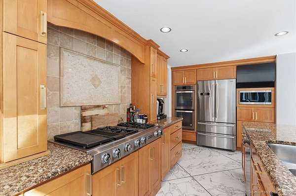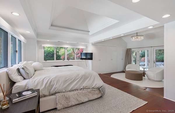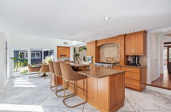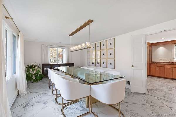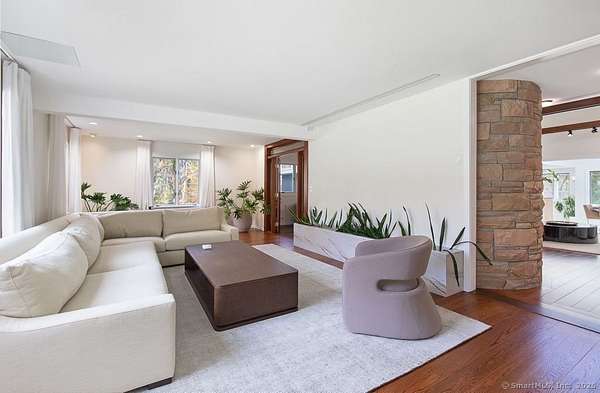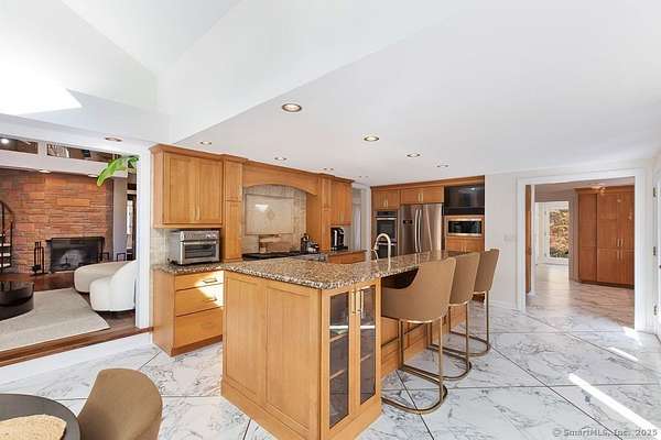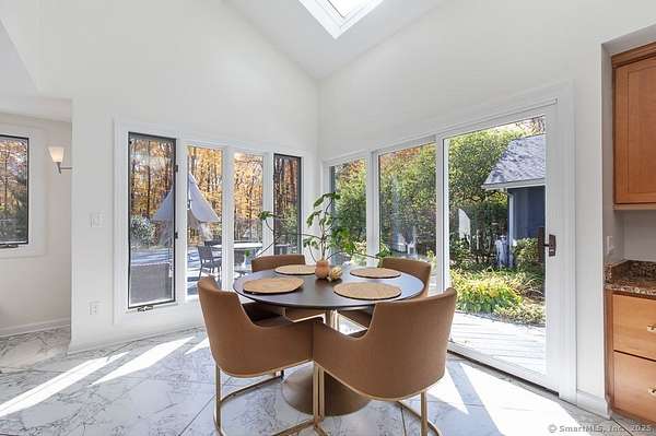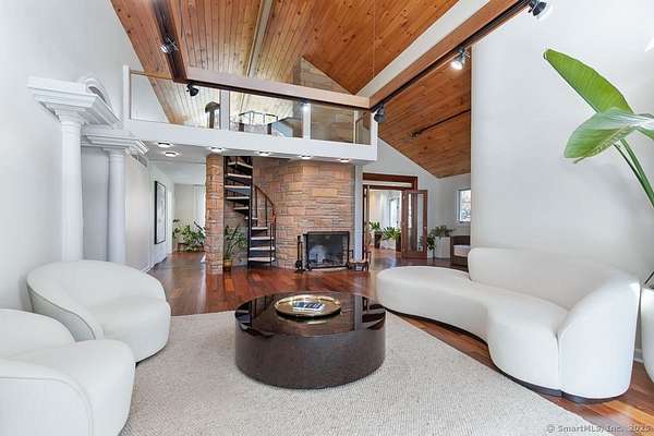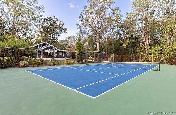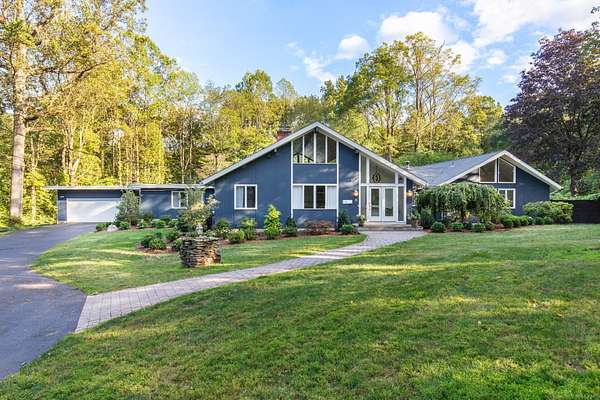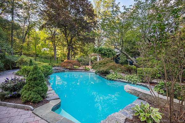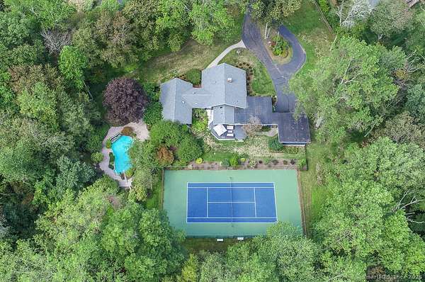 Bring the country club home with breathtaking gardens surrounding this magnificent contemporary California ranch, perfectly set at the end of a quiet cul-de-sac in one of Woodbridge's most desirable neighborhoods. You'd never guess you were just minutes from downtown New Haven while tucked away in this private nature lover's retreat backing up to the Wepawaug Falls-a series of cascading waterfalls owned by the Woodbridge Land Trust. Relax on the expansive deck and enjoy the tranquil sound of the backyard pond and waterfall. Take a dip in the heated gunite pool with spa or host a friendly game on your private tennis/sports court. Surround sound inside and out enhances every gathering. You simply won't find another property like this in Woodbridge! Step inside and be wowed by the open, light-filled layout with vaulted ceilings, gleaming hardwood floors, and designer lighting. A welcoming foyer leads to the formal living room and a spectacular great room with custom stone fireplace and spiral staircase to an open loft. The chef's kitchen with adjoining butler's pantry opens to a spacious formal dining room. Four generous bedrooms include a primary suite with spa-like bath, abundant custom closets, and a private deck overlooking the grounds. Lower-level adds even more living space. Conveniently located close to major highways, shops, restaurants, and Yale University.