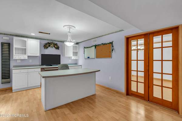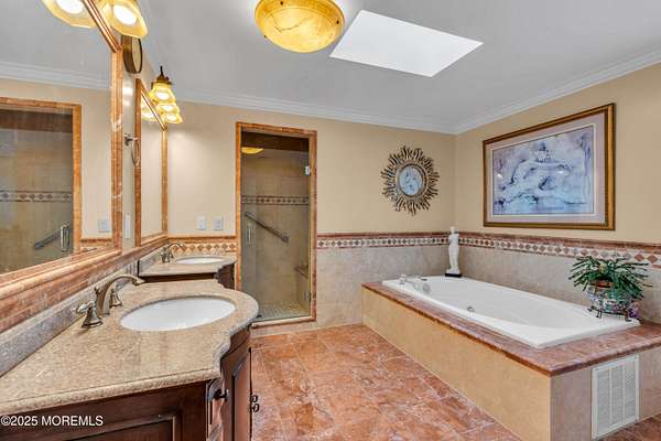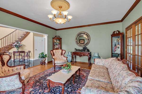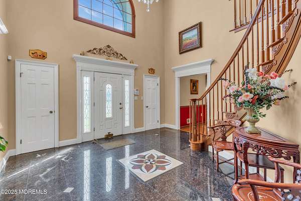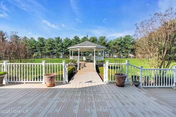 This stunning 5 bed, 3.5 bath Tudor-style home sits on over 2 acres of beautifully landscaped, flat grounds with easy county road access. The home features a 6ft chandelier foyer with circular staircase, formal living and dining rooms with chandeliers, crown molding throughout, and an entertainer's dream 21x21 family room plus 33x18 eat in custom kitchen opening to a lifetime nail free AZEK deck. A first-floor guest suite and large laundry room with cabinets and sink, leading to a 3-car garage, add convenience and functionality. The master suite offers a sitting room, walk-in closet, and spa bath with Jacuzzi and skylight. Back stairs lead to the other bedrooms, each with walk-in closets, complemented by a 30x11 bonus room with seven closets. Colts Neck residents enjoy access to two of New Jersey's top 10 magnet high schools and premier private school options, making this home ideal for both lifestyle and education. Additional highlights include a lifetime Timberline HD Slate roof and maintenance-free facade, hardwood floors, indoor/outdoor security, full-house generator, walkout basement with home offices and billiard room, gazebo, pagoda, and 11 zone lawn sprinkler system. Move in ready and set on flat, landscaped acreage - this Colts Neck gem is waiting for your personal touch.