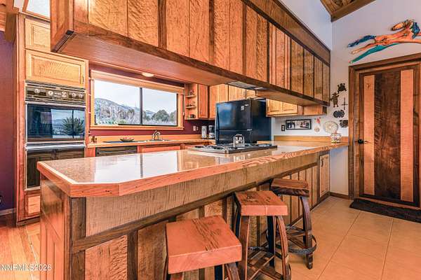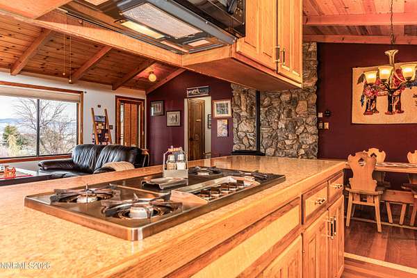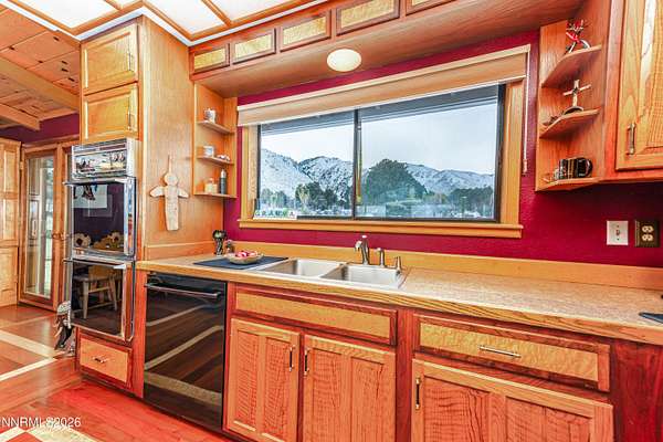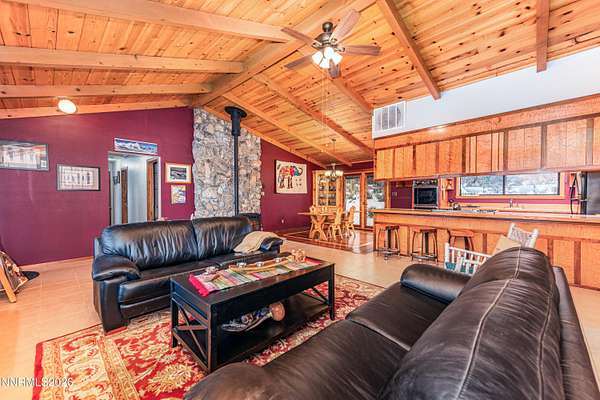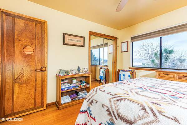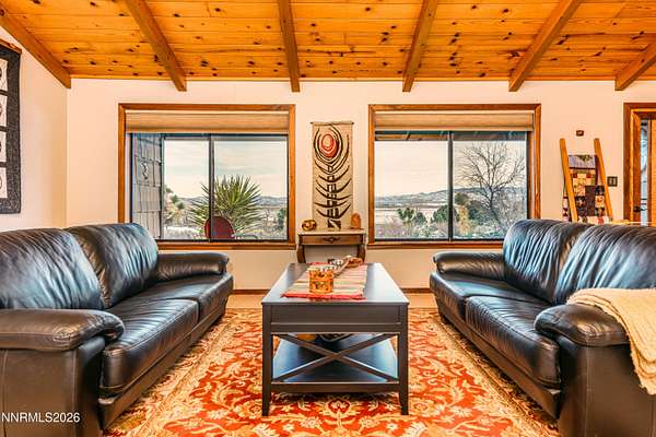 Experience Smith Valley' beautiful views and rural peace and quiet, and enjoy the warmth of the real wood interior artistry and creativity of a home loved and cared for over a 30+ year ownership. A great bonus is the 2900sf work shop! Perfect for vehicles, hobbies or your latest projects. Combined with the desert vegetation against a back drop of the Pinenut Mountains and almost 360 deg views, this is country living without being rustic. Enter the great room area - light and bright with vaulted, pine planked ceilings, tiled floor and an efficient pellet stove sited on a stone hearth against a rock wall. Wide windows bring in the views of the green valley and distant mountains The adjacent dining and kitchen area have real hardwood floors and a combination of other contrasting woods in the kitchen cabinetry. The artistry continues through the home with decorative doors and frames showing desert and mountain motifs. Views are available from all bedrooms adding to the country feeling without losing privacy. Neighbors are all on approx.. 5 acre lots, so mostly not in the view. Lots of space for your horses and easy access to thousands of acres of BLM land for riding hiking, or off road vehicles. This combination of home and shop is exactly what you need! Please see the Virtual Tour and ask your Buyer's Agent to set up an in-person visit.