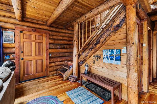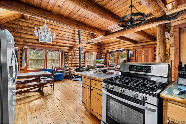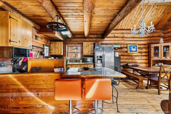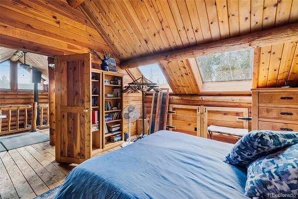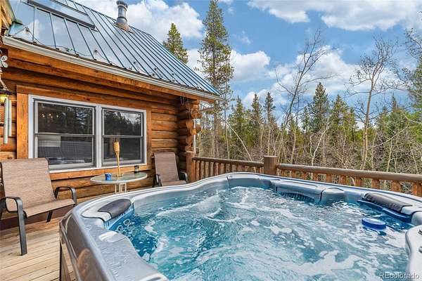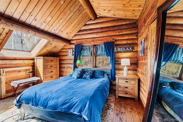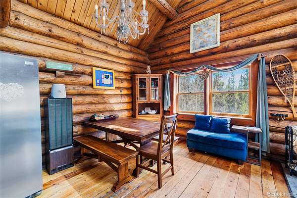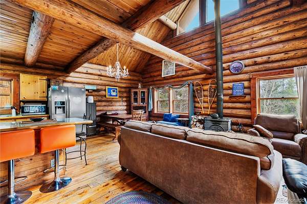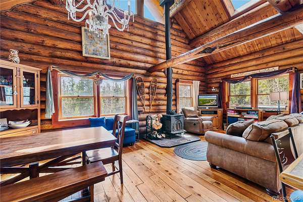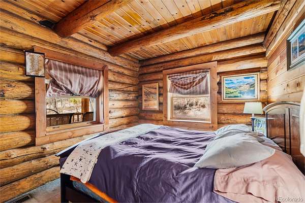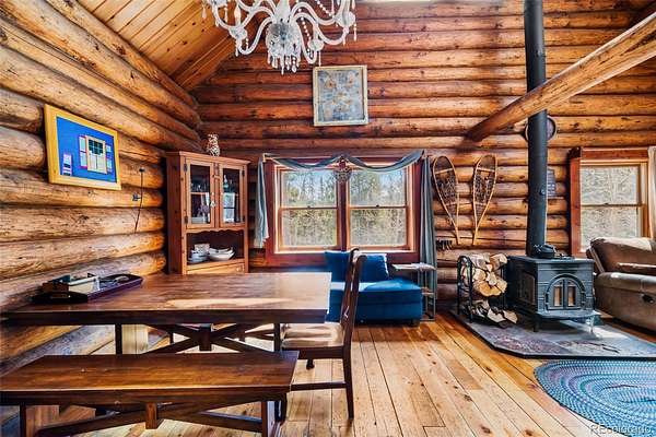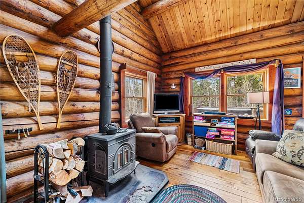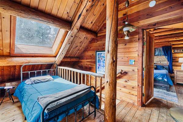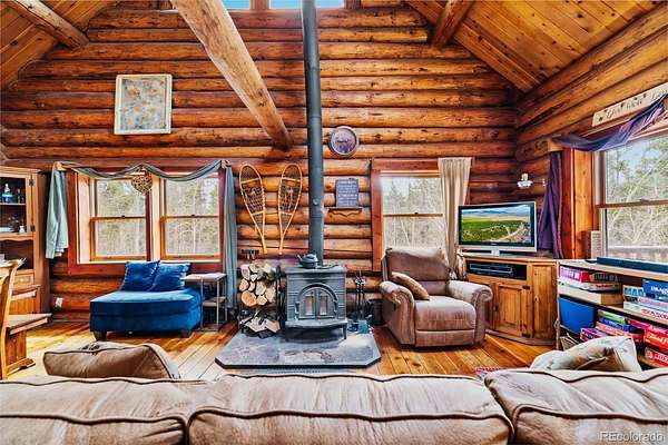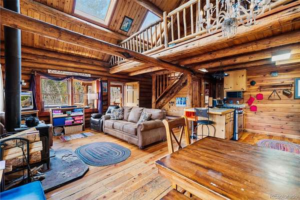 Private, rustic log cabin retreat! Built with full hand-hewn round logs, this solid home offers exceptional seclusion at the end of a quiet cul-de-sac. Situated on 2.07 pristine acres, the property features a beautiful mix of aspen and pine trees and borders National Forest land, with Sacramento Creek just moments away. Inside, enjoy the warmth of a wood-burning stove along with a recently updated forced-air furnace. Wood floors and tongue-and-groove finishes enhance the cozy, peaceful atmosphere. Step outside to a spacious, partially covered deck—perfect for relaxing in the hot tub under stunning star-filled skies. Additional highlights include ample closet space, a large crawl space for extra storage, an oversized shed, and a horse corral. With a strong rental history, this woodland getaway is both a serene escape and a fantastic investment opportunity.