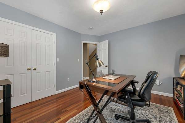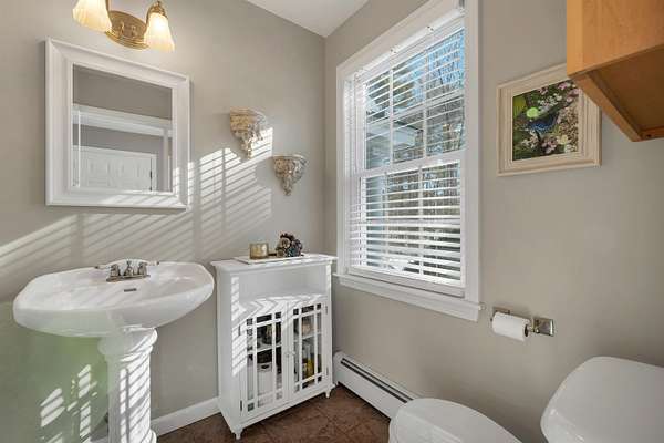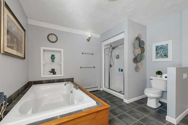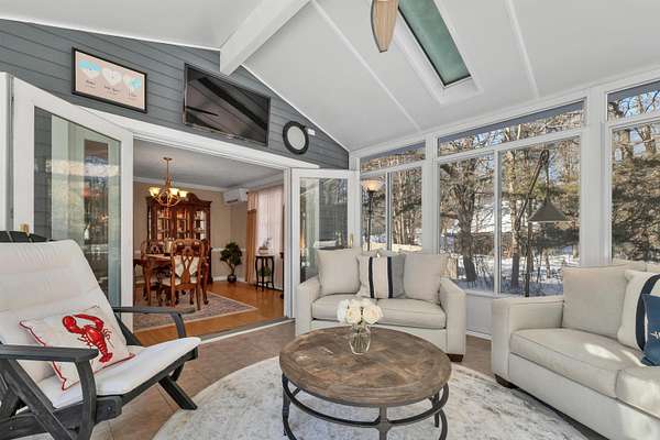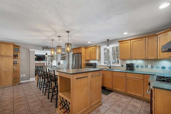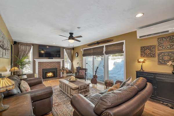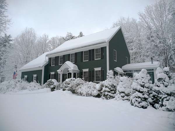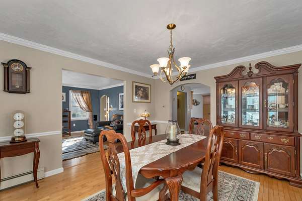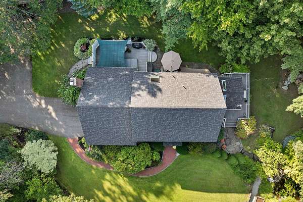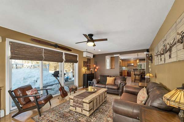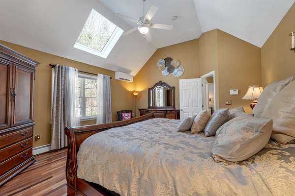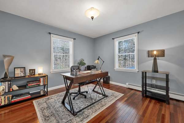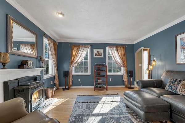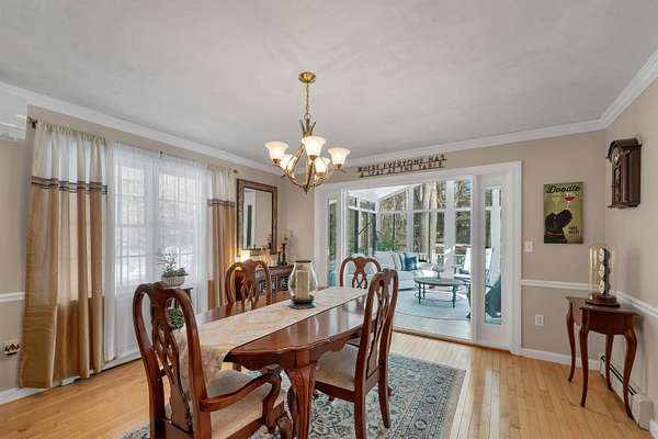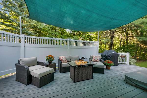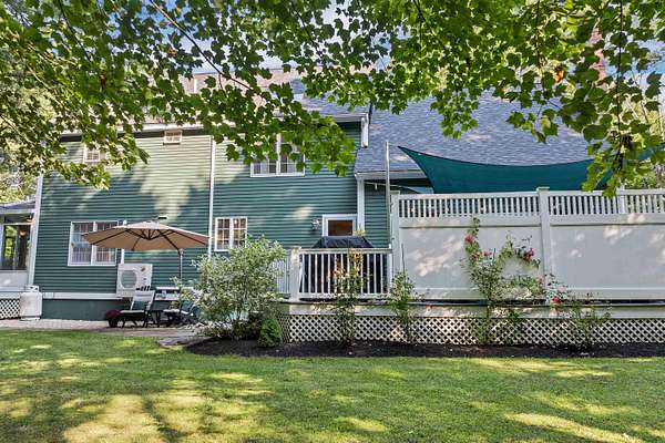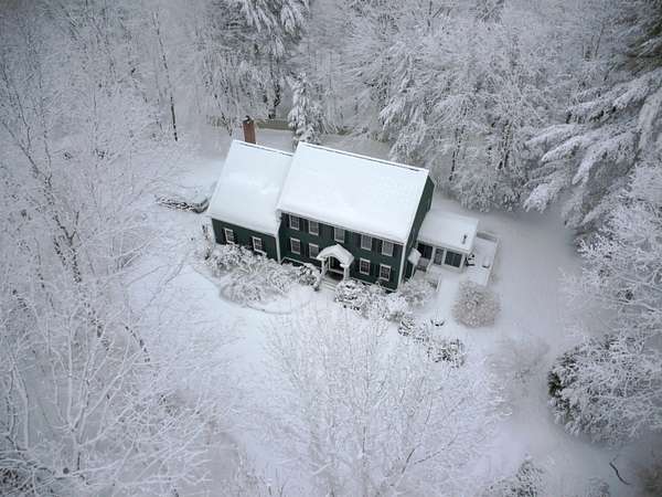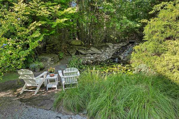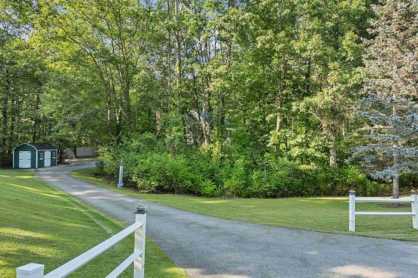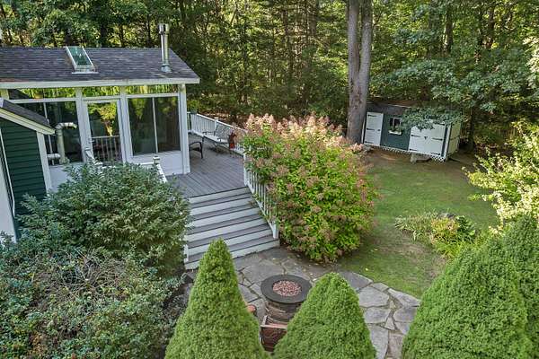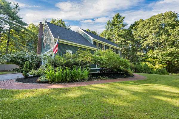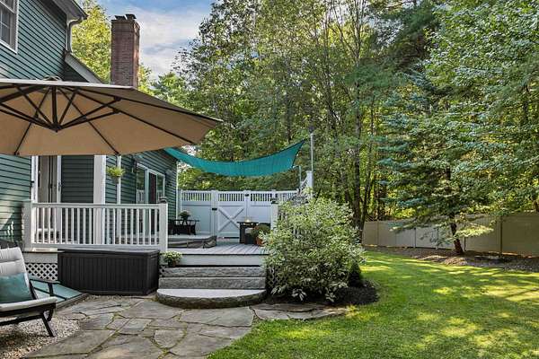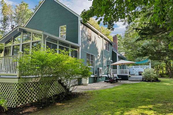 Set on 2.42 landscaped acres abutting conservation land and located on a cul-de-sac, this classic Colonial offers space and everyday comfort with convenient access to Route 101, regional commuter routes, and nearby town centers. With over 2,800 square feet, this 4-bedroom, 2.5-bath home features a functional layout designed for gathering and daily living. Hardwood floors and generous room sizes provide flexibility for entertaining, remote work, or hobbies. The main level includes a formal dining room and dedicated study, along with a well-equipped kitchen offering abundant cabinetry, slate countertops, a center island, and easy flow into adjoining living areas. A fire-lit living room and sun-filled three-season room add warmth and versatility. All four bedrooms are located on the second floor, including a primary suite with cathedral ceilings, three walk-in closets, and a private bath featuring a soaking tub. The additional bedrooms offer comfortable proportions and convenient access to the full hall bath. An attached two-car garage adds convenience, while the partially finished basement provides bonus space, room for a home gym, and storage, along with a dedicated laundry area with washer and dryer. A full walk-up attic offers substantial unfinished space for storage or possible future expansion, subject to local permitting. Multiple heating options include an oil-fired furnace, propane fireplace, pellet stove, and energy-efficient mini-splits that provide A/C and supplemental heat for year-round comfort. Outside, mature landscaping supported by an in-ground irrigation system surrounds a koi pond, two decks, and hot tub. Two storage sheds provide additional storage. Offering room to gather, work, relax, and grow, 5 Ridge Road provides flexible living within a well-established Newfields setting.