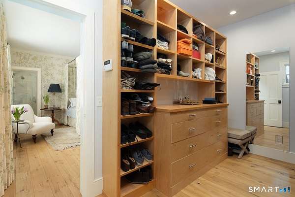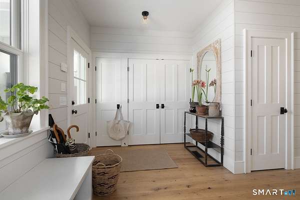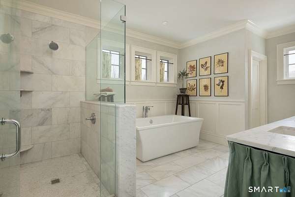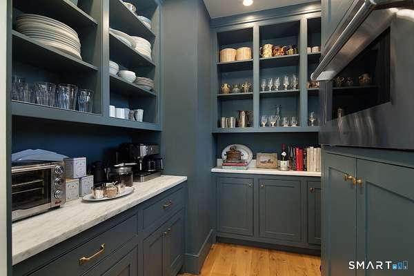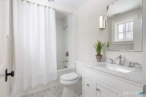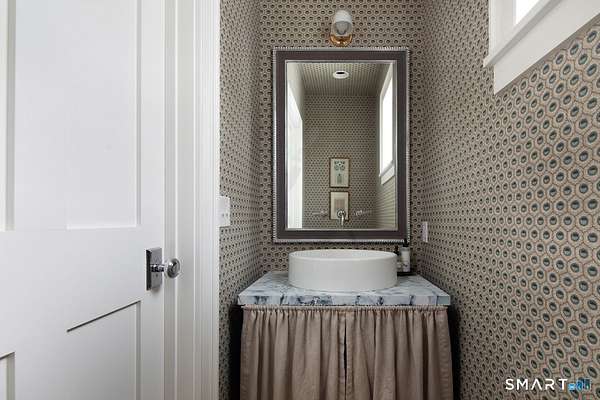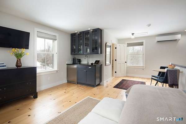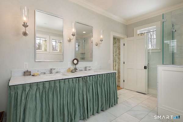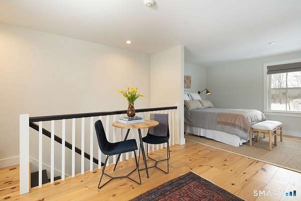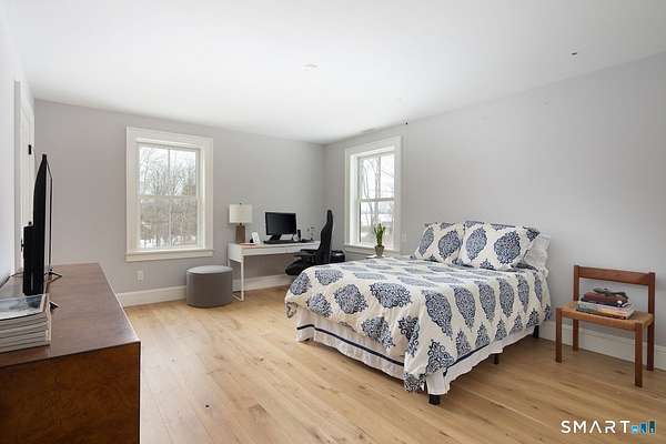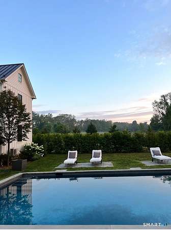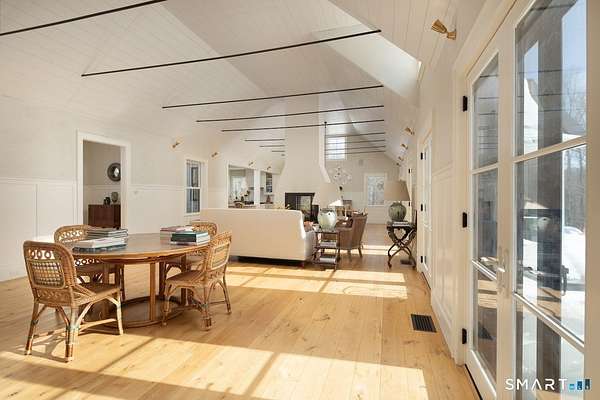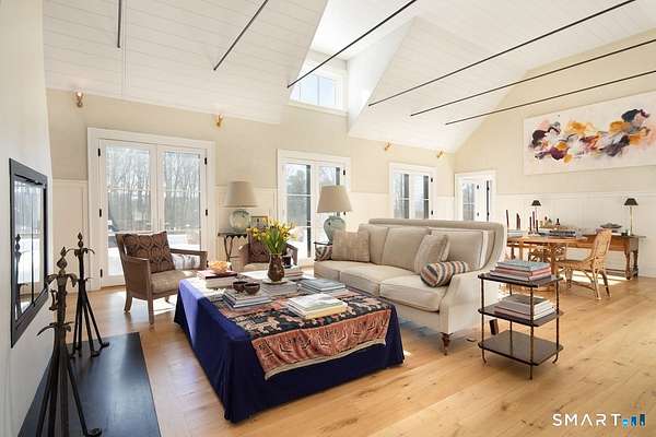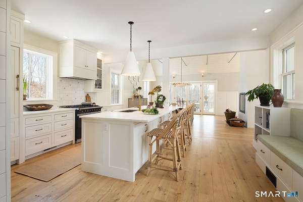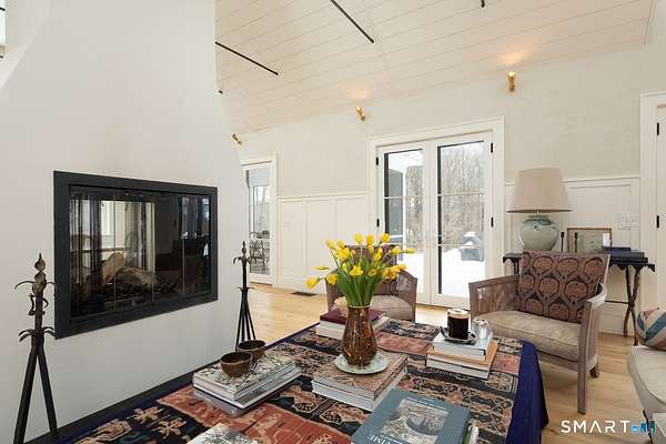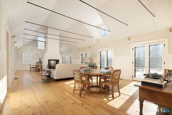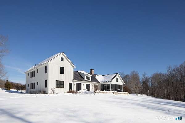 Set on three pastoral acres in a private setting, this modern farmhouse offers timeless craftsmanship paired with thoughtful contemporary design. The four-bedroom, three-and-a-half-bath residence is beautifully proportioned for both refined entertaining and comfortable everyday living. A light-filled open floor plan is anchored by a chef's kitchen featuring a Lacanche range and custom butler's pantry, designed to support both daily living and elevated entertaining. The kitchen flows seamlessly into expansive living and dining areas, centered around a striking double-sided wood-burning fireplace. Southwest-facing French doors open to a serene screened-in porch and adjoining bluestone patio with a built-in fireplace, creating an effortless connection between indoor and outdoor living. A stunning library with custom-built-in shelving and cabinetry provides an elegant retreat for work or quiet moments. The primary suite offers a private sanctuary designed for rest and relaxation, featuring a beautiful light-filled bedroom and spa-like bath that blend sophistication with a calm, restorative ambiance. The second floor includes three additional bedrooms and two full baths, offering well-balanced space for family and guests. Additional highlights include a one-car garage with a private second-floor apartment featuring a full bath and kitchenette-ideal for guests, extended family, or a home office.