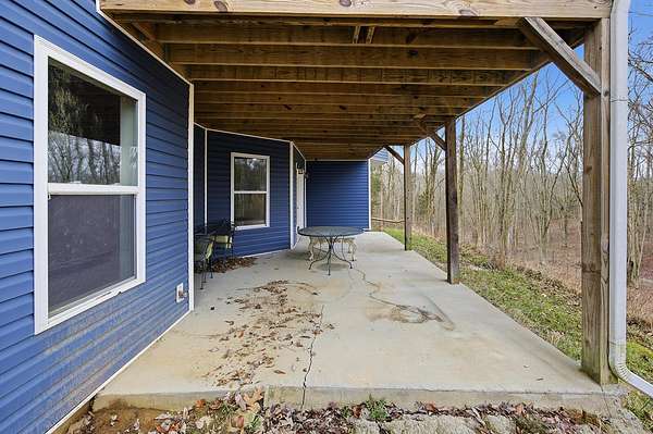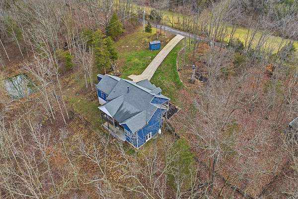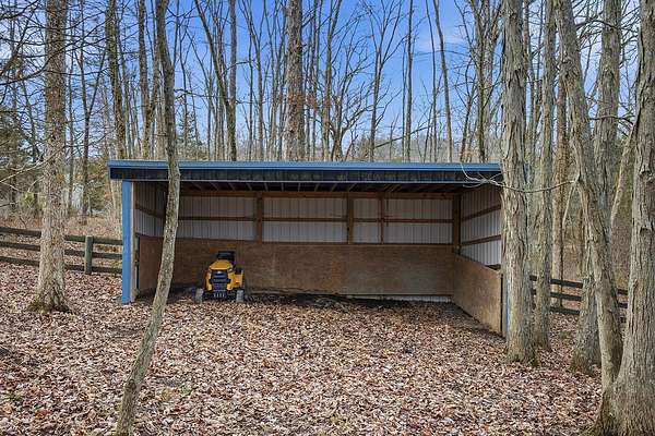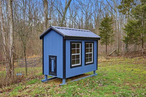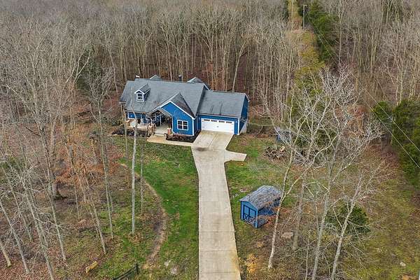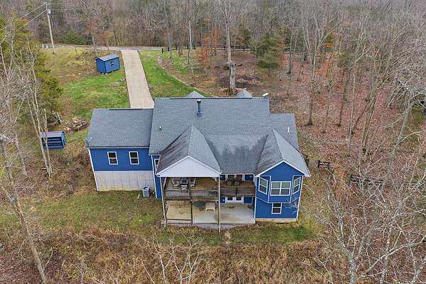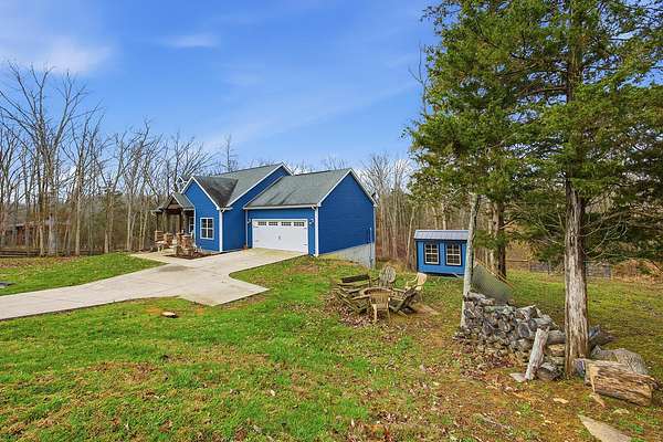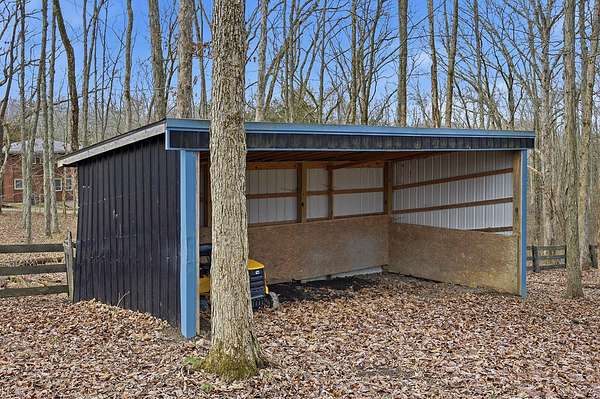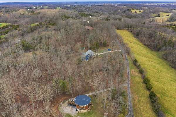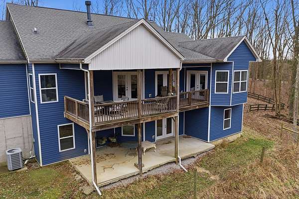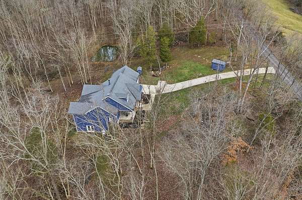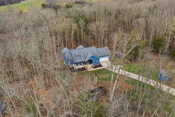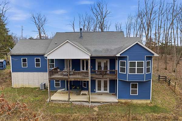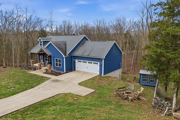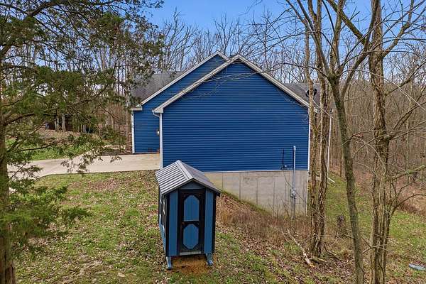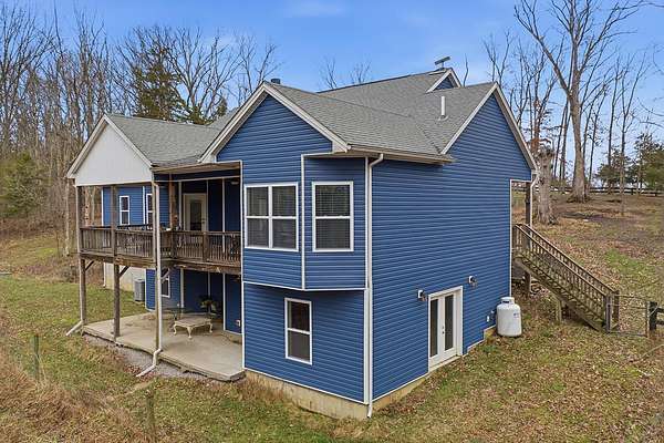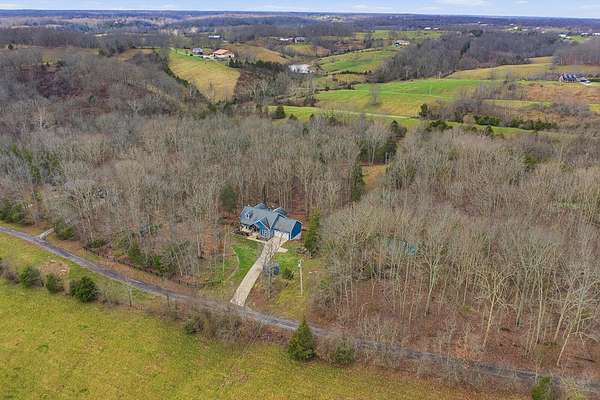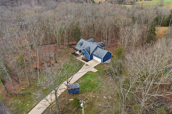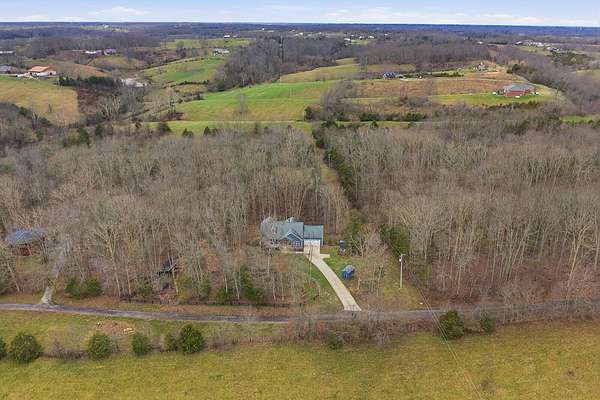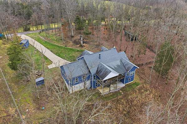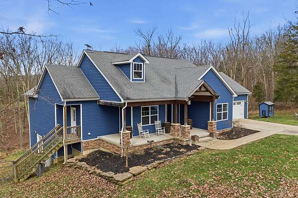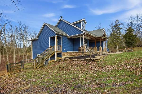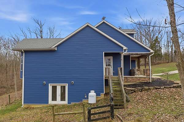 This luxurious homes sits nestled amongst the trees in the country community of earth haven. This is where modern style and elegant finishes meets the calming presence of flora and fauna. This homes sits nearly 4 miles from interstate 64 give quick access to both Lexington and Louisville while also being within 10 minutes of both Lawrenceburg and Frankfort. This young home features tall ceilings and stone accents around to bring the expanse of the wild into the home. Natural lighting from the large array of double french doors and windows makes the home feel alive. The copper sink in the kitchen with exotic granite counter are what the home's original builders design the house around bring a nice dark contrast to brightness of the living room and kitchen. The large walk in closet in the primary bedroom offers ample storage for a large wardrobe. Tying the home closer the land it sits on is the offering of multiple covered porches and patios, with the highlight being the back porch. This oversized covered, lit, and fanned elevated porch offers an oasis overlook into nature. This large porch can be accessed not only from the living rooms two set of double french doors but also the primary bedrooms double french doors and a secondary bedroom, giving the option to open everything up and let the outside in. The basement though unfinished sports tall ceilings and window and door walkout access giving the ability for future bedroom additions if desired. The basement also has room that is situated under the concrete front porch with concrete walls on all sides which may have the ability to be turn into a safe or storm room. The over 7 acres this home sits on host many mature tree and grass. The front of the home was once fenced in for horses and cattle but has been under going a transition to be true grass yard but still has a spacious run-in shed. The rear land of the property is still completely fenced if live stock is in your desires. The rear also has a creek/ spring to help with live stock watering. An out building and a chicken matching the color of the house will also be yours with this property. The property owner association fees of $55 dollars a month goes to pay for your trash bill as well as road maintenance. Come view and make this elegant modern house in the country your home today!