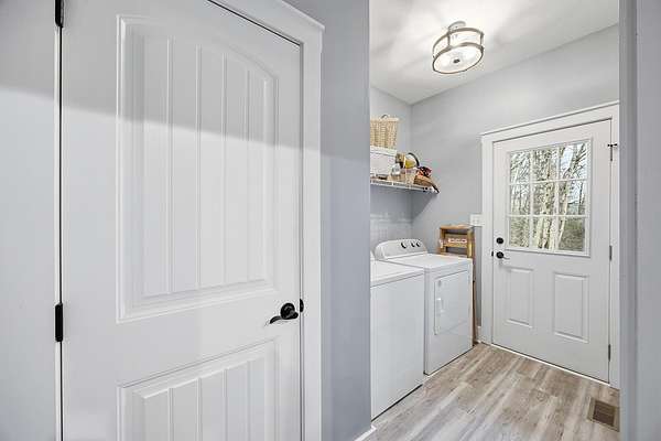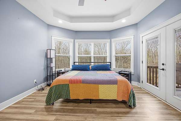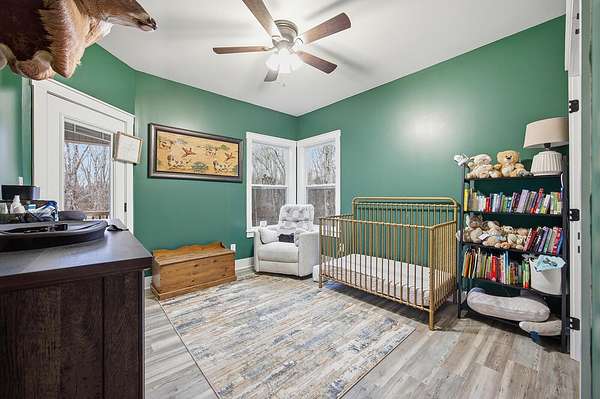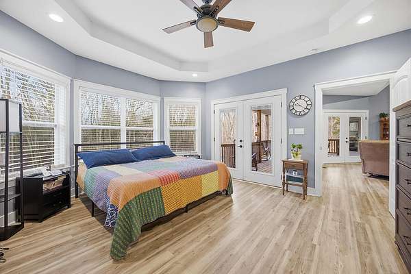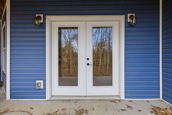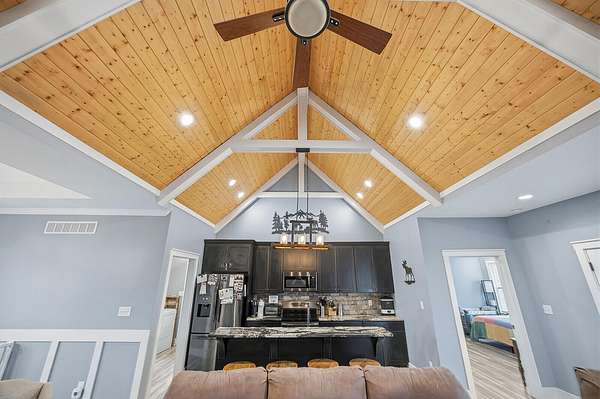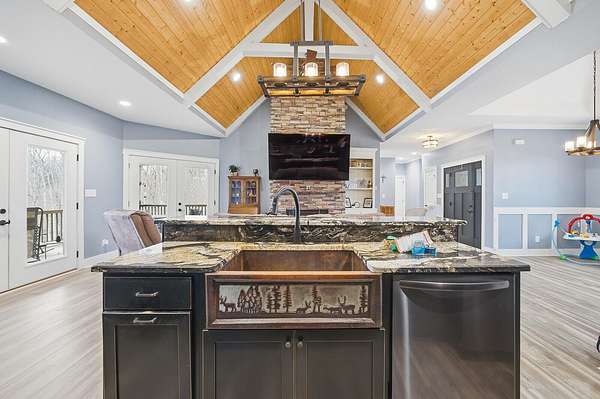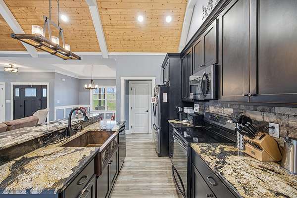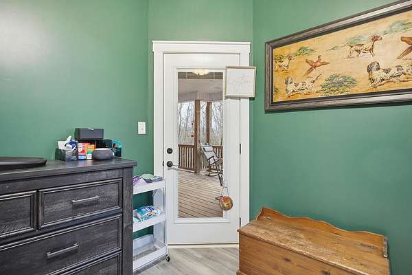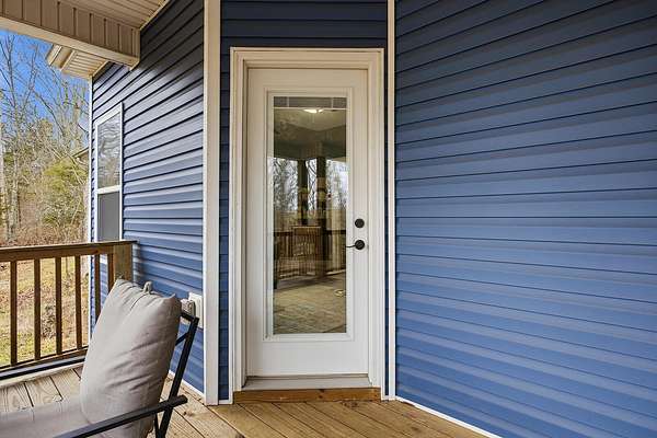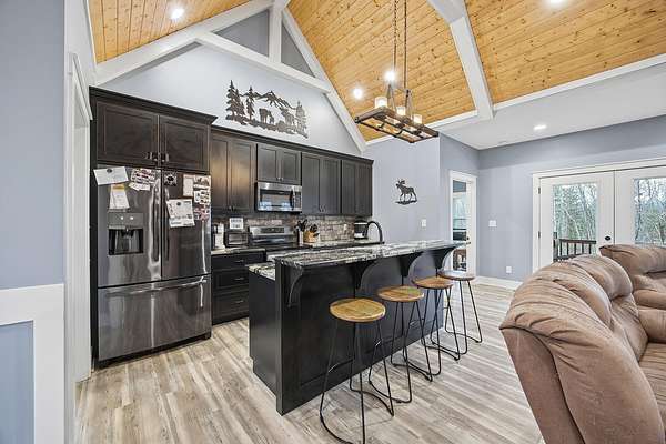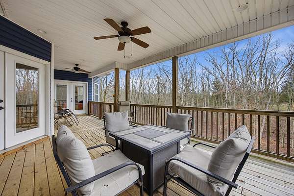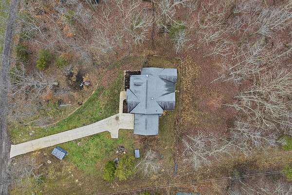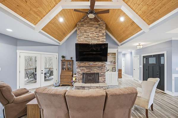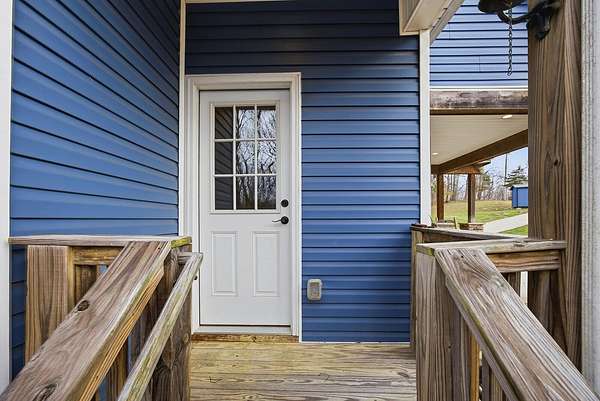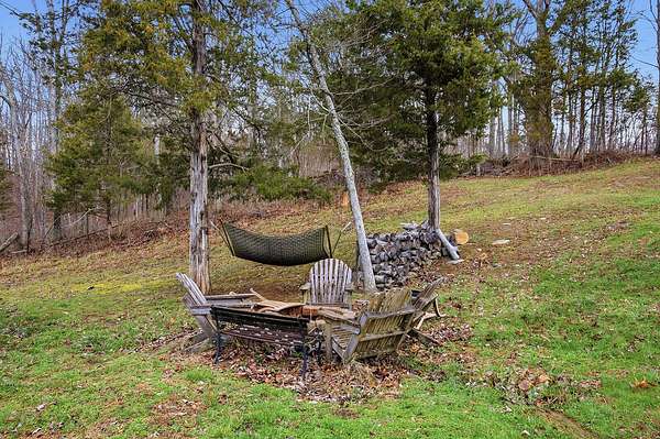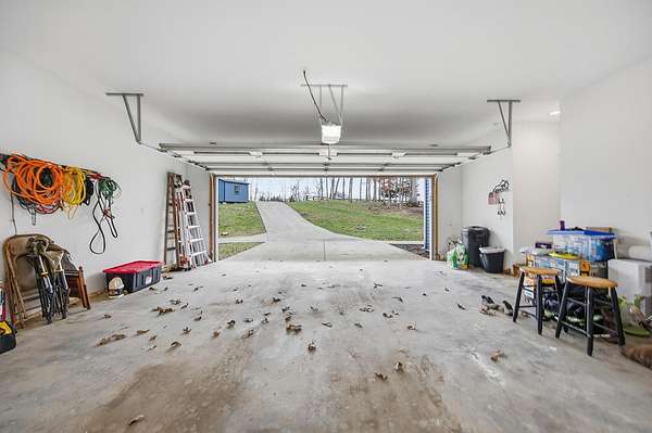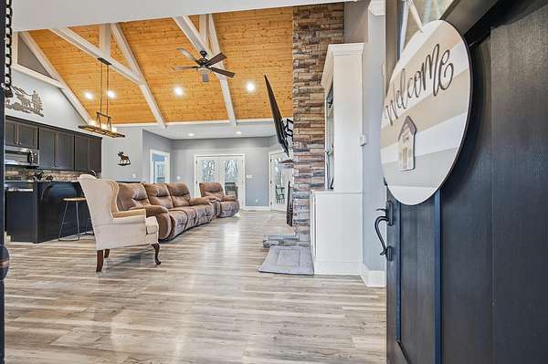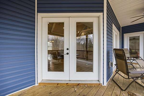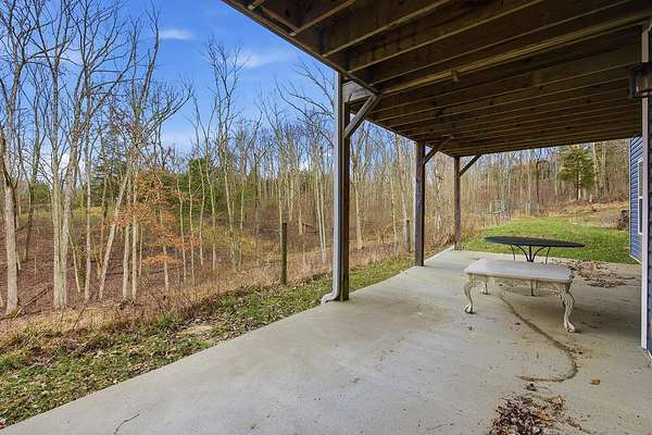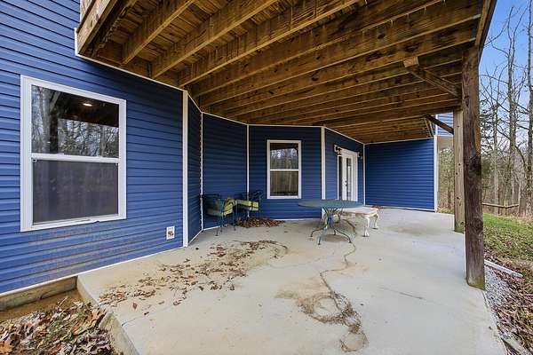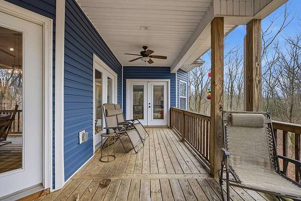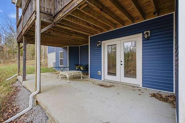 This luxurious homes sits nestled amongst the trees in the country community of earth haven. This is where modern style and elegant finishes meets the calming presence of flora and fauna. This homes sits nearly 4 miles from interstate 64 give quick access to both Lexington and Louisville while also being within 10 minutes of both Lawrenceburg and Frankfort. This young home features tall ceilings and stone accents around to bring the expanse of the wild into the home. Natural lighting from the large array of double french doors and windows makes the home feel alive. The copper sink in the kitchen with exotic granite counter are what the home's original builders design the house around bring a nice dark contrast to brightness of the living room and kitchen. The large walk in closet in the primary bedroom offers ample storage for a large wardrobe. Tying the home closer the land it sits on is the offering of multiple covered porches and patios, with the highlight being the back porch. This oversized covered, lit, and fanned elevated porch offers an oasis overlook into nature. This large porch can be accessed not only from the living rooms two set of double french doors but also the primary bedrooms double french doors and a secondary bedroom, giving the option to open everything up and let the outside in. The basement though unfinished sports tall ceilings and window and door walkout access giving the ability for future bedroom additions if desired. The basement also has room that is situated under the concrete front porch with concrete walls on all sides which may have the ability to be turn into a safe or storm room. The over 7 acres this home sits on host many mature tree and grass. The front of the home was once fenced in for horses and cattle but has been under going a transition to be true grass yard but still has a spacious run-in shed. The rear land of the property is still completely fenced if live stock is in your desires. The rear also has a creek/ spring to help with live stock watering. An out building and a chicken matching the color of the house will also be yours with this property. The property owner association fees of $55 dollars a month goes to pay for your trash bill as well as road maintenance. Come view and make this elegant modern house in the country your home today!